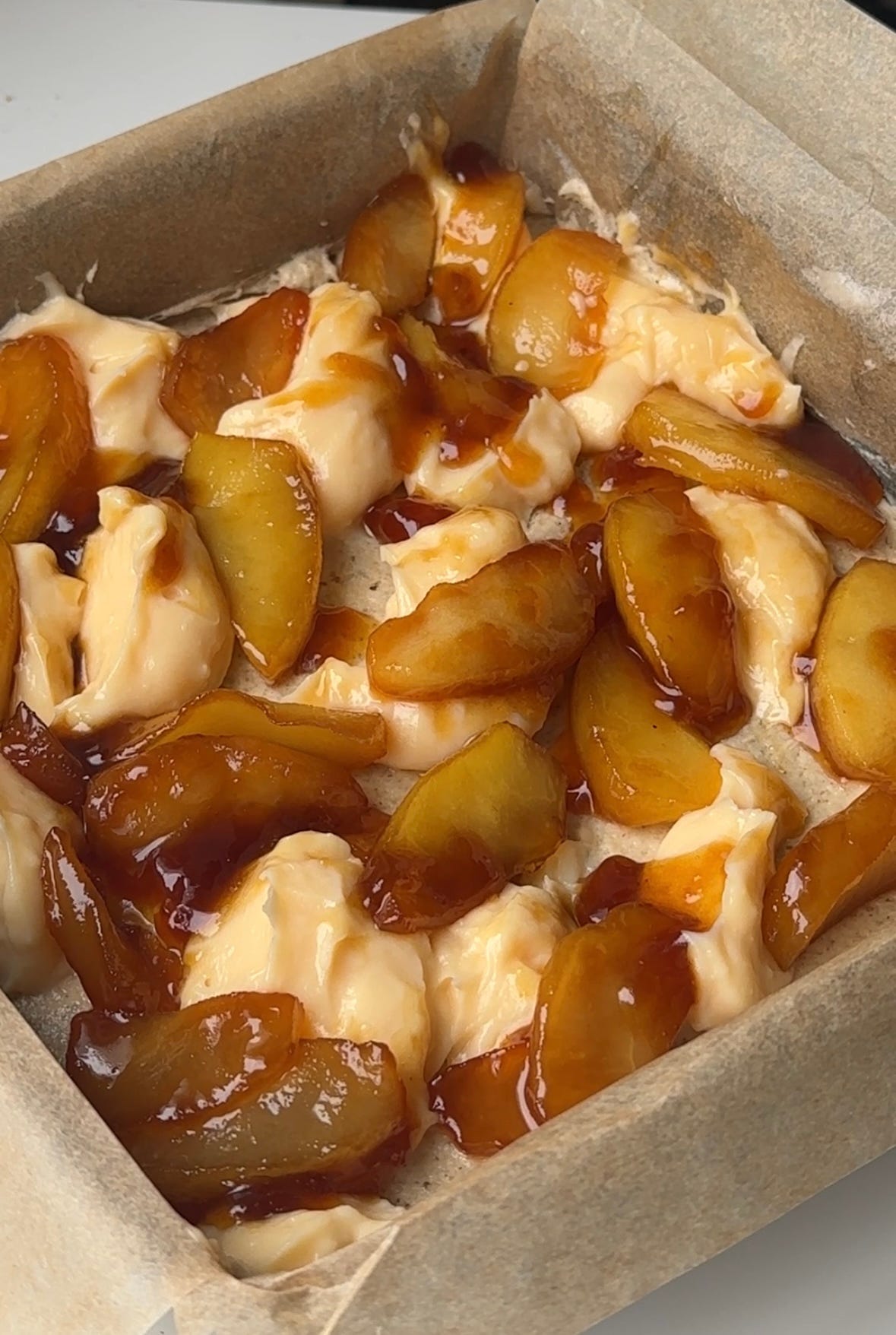 Spread the batter evenly on the base. Loosen the pastry cream, as it will have gelled, by stirring. Dot the cake with generous blobs then place apples all over the top. Scrape any caramelised juices on, too!