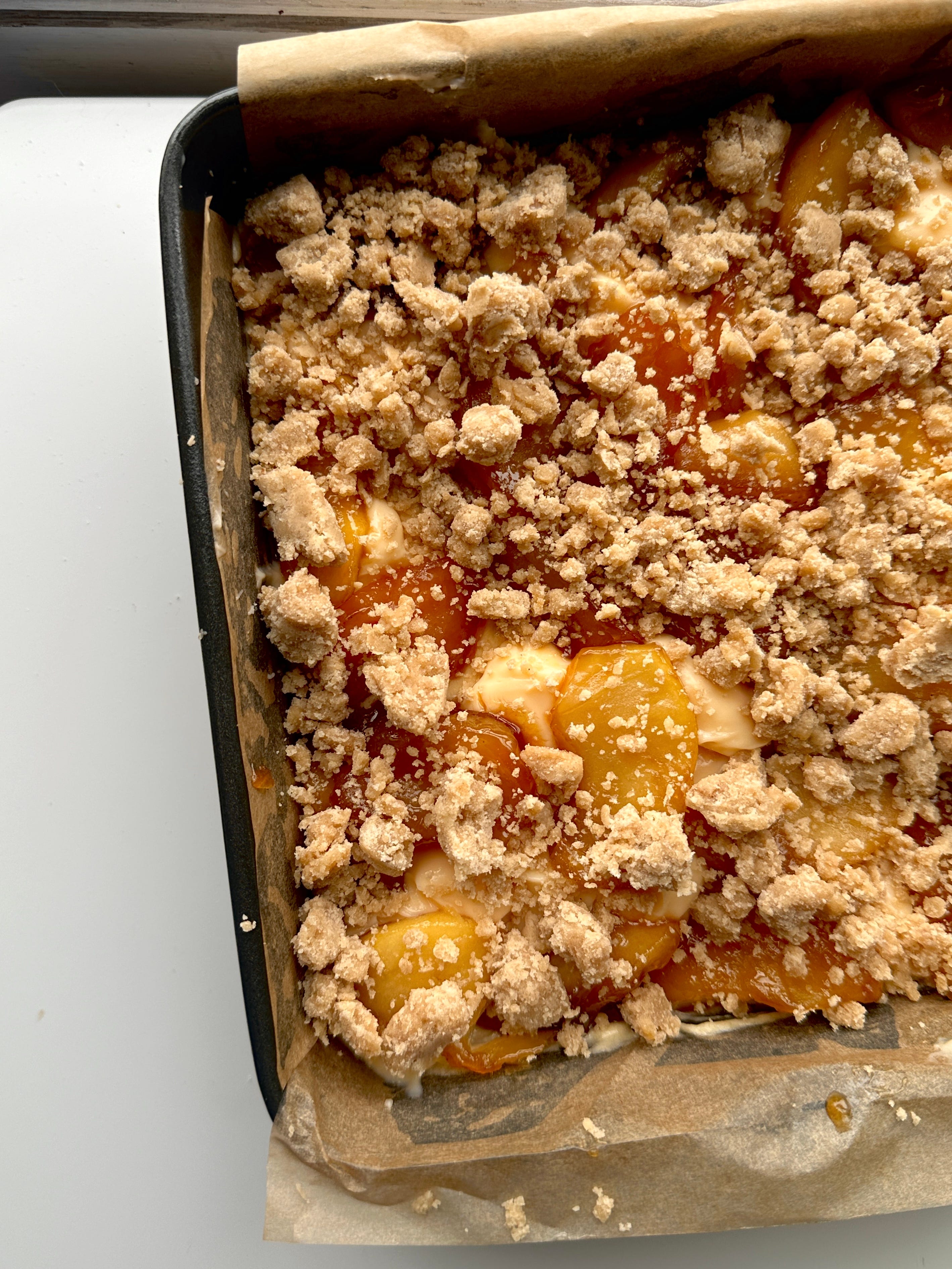 Finally, scatter generously with the crumb, making sure there is still space for the cake and custard to peek out. Bake for 45–55 minutes. It’s ready when there’s only the slightest hint of a wobble in the middle. Check the internal temp is 96°C. A skewer may not come out clean because of the fruit and custard.
