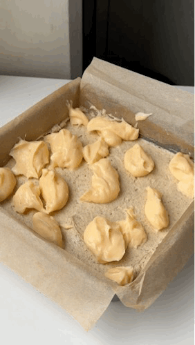 Preheat the oven to 190°C/170°C fan. Line the square tin with baking paper extending above the tin's lip by 5cm to help you remove it later. S