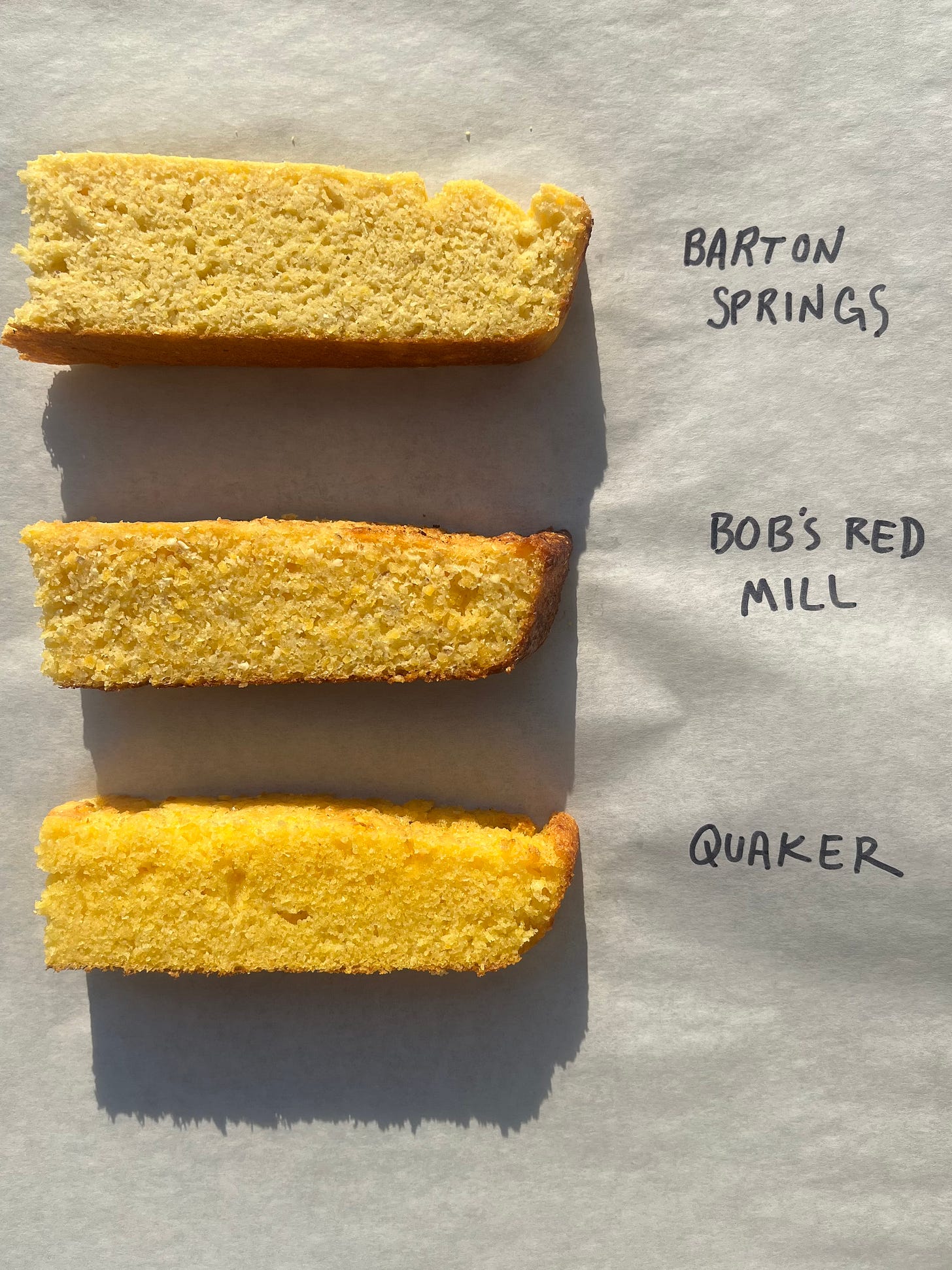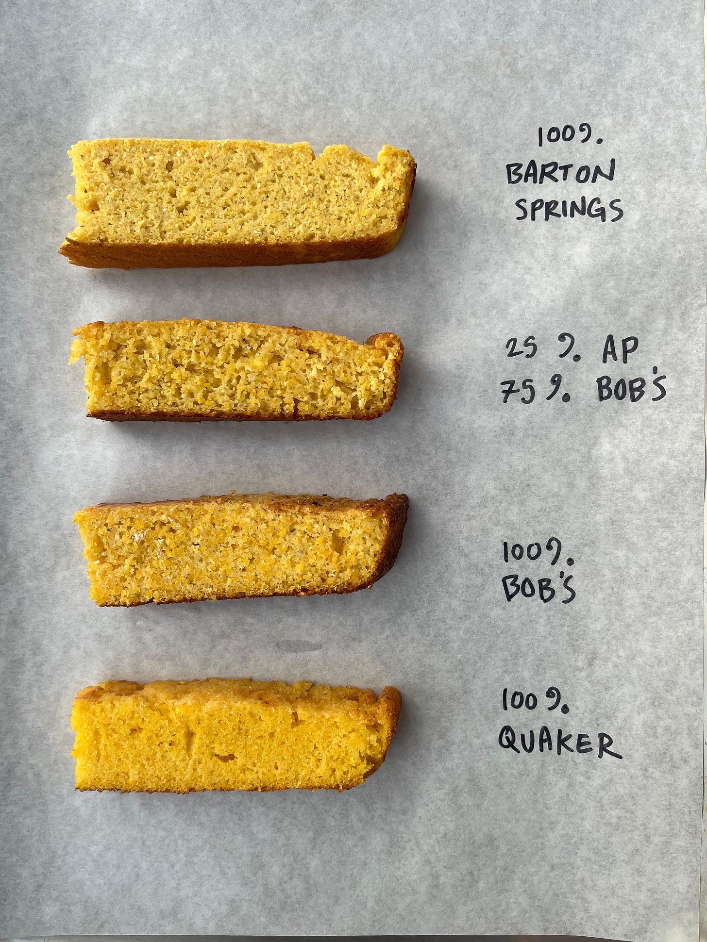 My first task was to confirm the theory that stone ground cornmeal resulted in a higher rise and sweeter taste. I made three batches of cornbread using an identical, traditional method and ratio - meaning no sugar, no wheat flour, and cooked in a hot cast iron skillet - and compared the texture. For my initial test, I used the gorgeous, premium Barton Spring’s stone ground yellow cornmeal, Bob’s Red Mill stone ground yellow cornmeal (the only stone ground product widely available in stores), and Quaker brand enriched, degerminated yellow cornmeal (by far the finest and most uniform of the bunch). The difference in both flavor and texture was remarkable. The cornbread made with the degerminated cornmeal was, frankly, horrible - like a sour, congealed baked polenta. Bob’s Red Mill produced a fluffier product, but the flavor I was seeking wasn’t quite there, and the pronounced buttermilk tang felt distracting. The heirloom stone ground cornmeal was the winner, but even then, after snacking on it over the course of a few hours, I started to feel like it wasn’t quite right. Fresh from the oven and slathered with butter, it was delicious, but as it cooled it lost a lot of its luster.