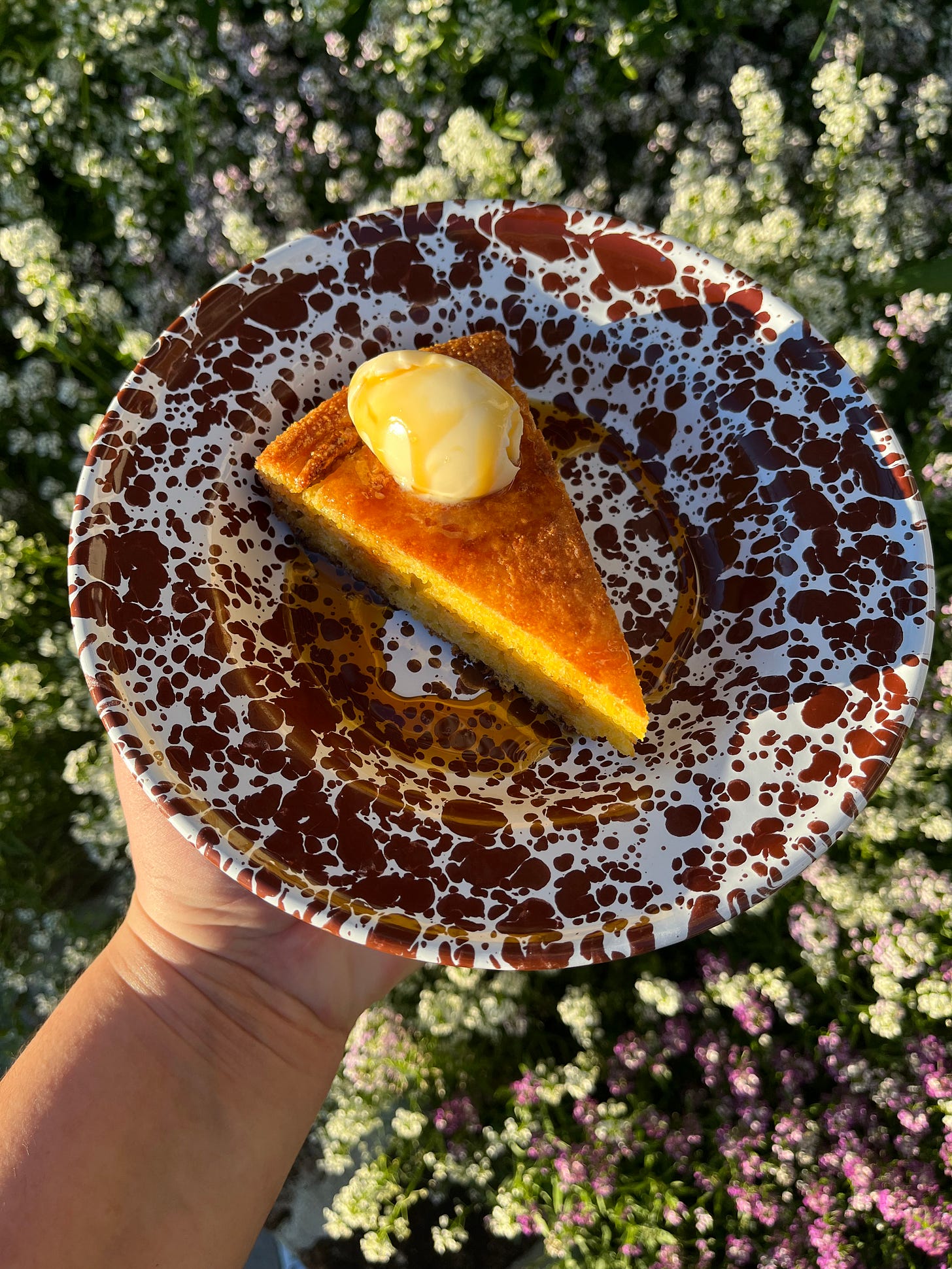 When I was growing up in Maryland, my Texan mother would always make cornbread in a cast iron skillet. It always featured yellow cornmeal, a crumbly texture, and crisp bottom crust. I’d eat my slices slathered in butter and honey. As I got older and started baking on my own, I favored sweeter cornbreads with tender, cakier crumbs - more reminiscent of Jiffy mix or the cornbread you’d get on the side at the rotisserie chicken restaurant Boston Market. This isn’t really surprising, considering my voracious sweet tooth, even though I knew, of course, that “real” southerners don’t put sugar in their cornbread. I don’t even remember learning this - it’s one of those things we absorb from the air in our humid summer childhoods.