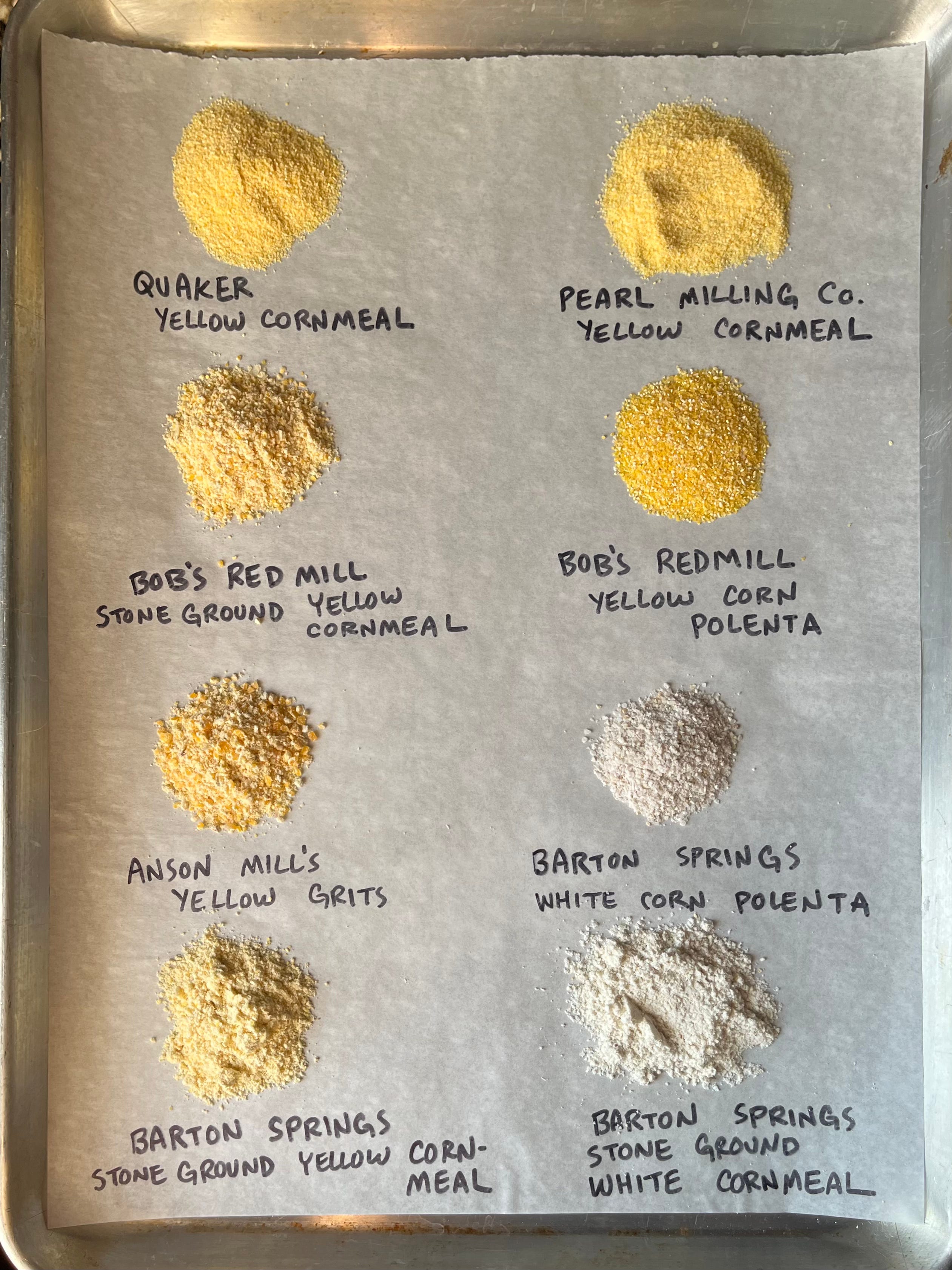 If roller mills produce a consistently-sized cornmeal grain, Moss argues that stone-ground cornmeal results in a diversity of particle size. I ordered several bags of stone-ground cornmeal from Barton Springs Mill in Texas to confirm, and it’s true - the cornmeal ranged from powdery to coarse within one bag. It’s this texture, says Moss, that produces a plush, tender cornbread without the addition of wheat flour. Further, large commercial roller mill operations harvest their corn crops early and dry them with forced air, while smaller stone milling operations may have the leisure to allow their corn to ripen fully in the field. And because stone milled cornmeal preserves the whole kernel of the corn, it has a more robust, sweeter, and corn-ier taste. The term “enriched, degerminated” cornmeal holds a clue - the oily germ and bran has been removed, making the product more shelf stable but depriving it of the full corn flavor.