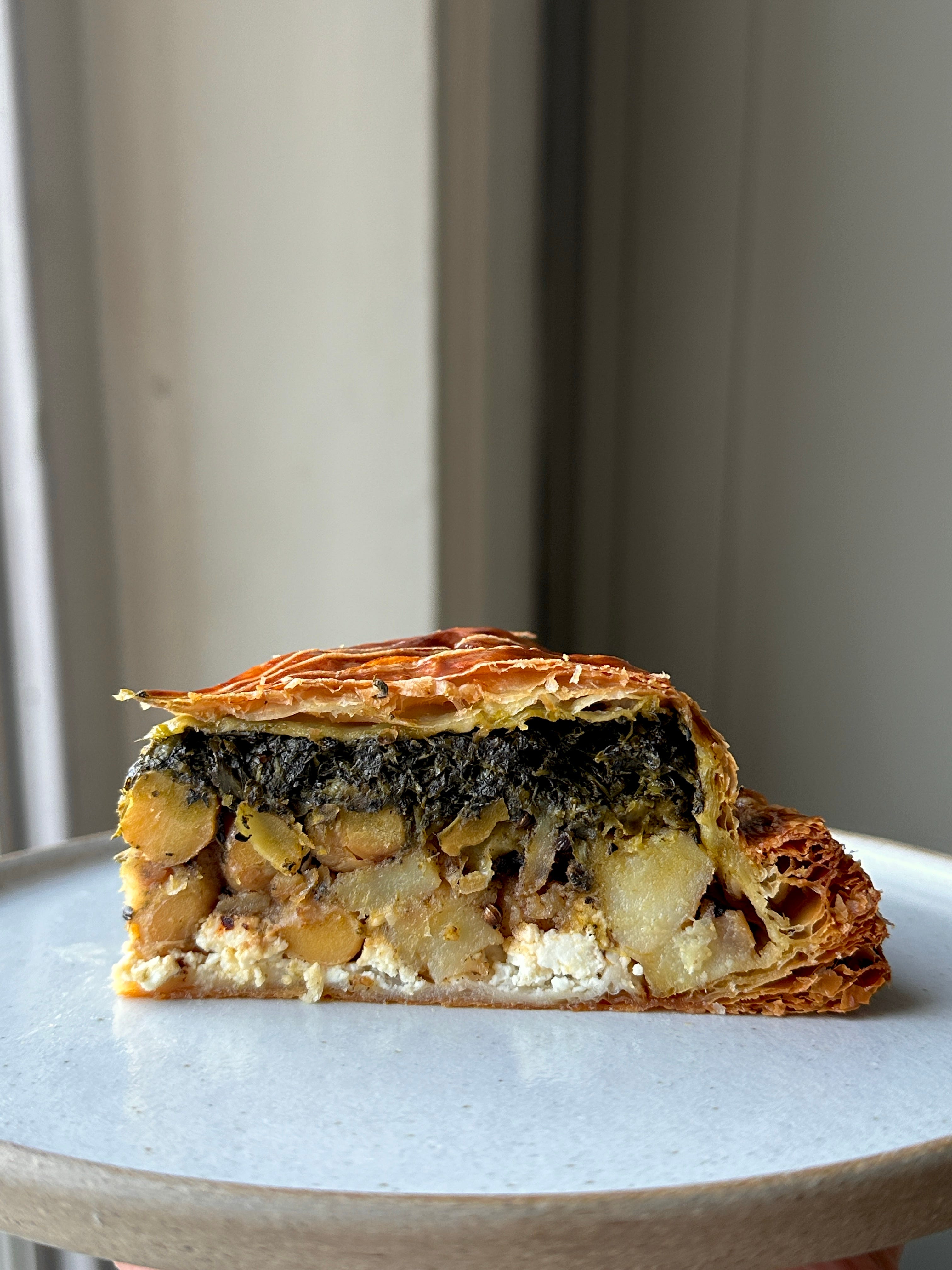 I’m unsure about the psychology of all this, but I am happy to throw that aside and continue our journey into the world of delightful puff pastry things this week. We’re diving into the world of savoury pithiviers with not one but two golden discs of joy: The first is a hearty greens, chickpea and potato pie, and the second, on KP+, is a juicy sausage, leek, fennel, and potato pie. These are both my dream winter eating and baking projects, so let’s dive in.