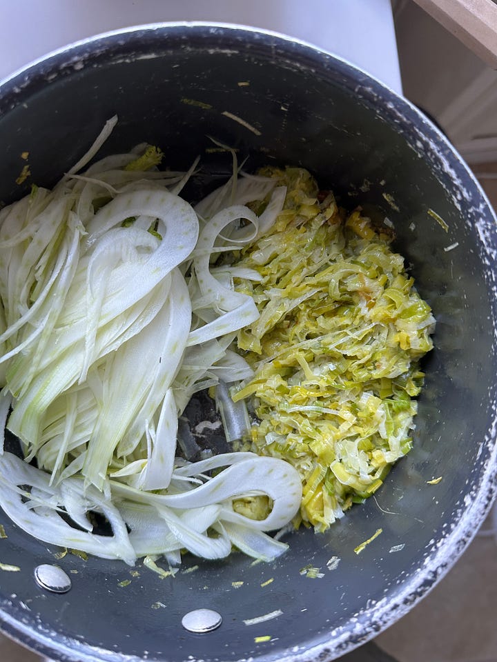 For the leeks and fennel, I started by simmering the leeks in butter until melting before adding the very thinly sliced fennel. Thinly sliced is the key here otherwise it never cooks down to an aromatic mush. With the help of bay leaves, white wine and stock, you end up with a spreadable paste that tastes about 1000x better than it looks.