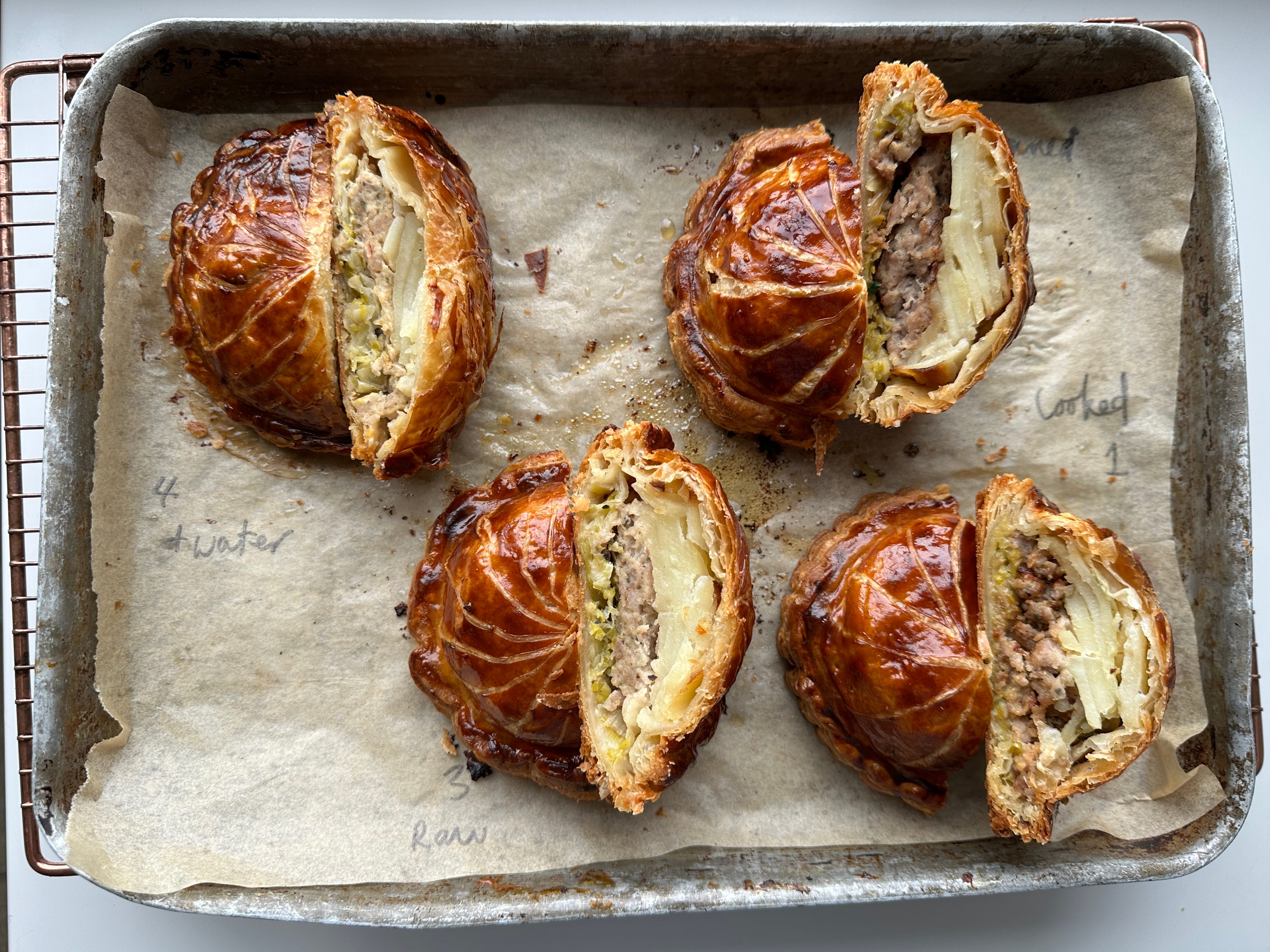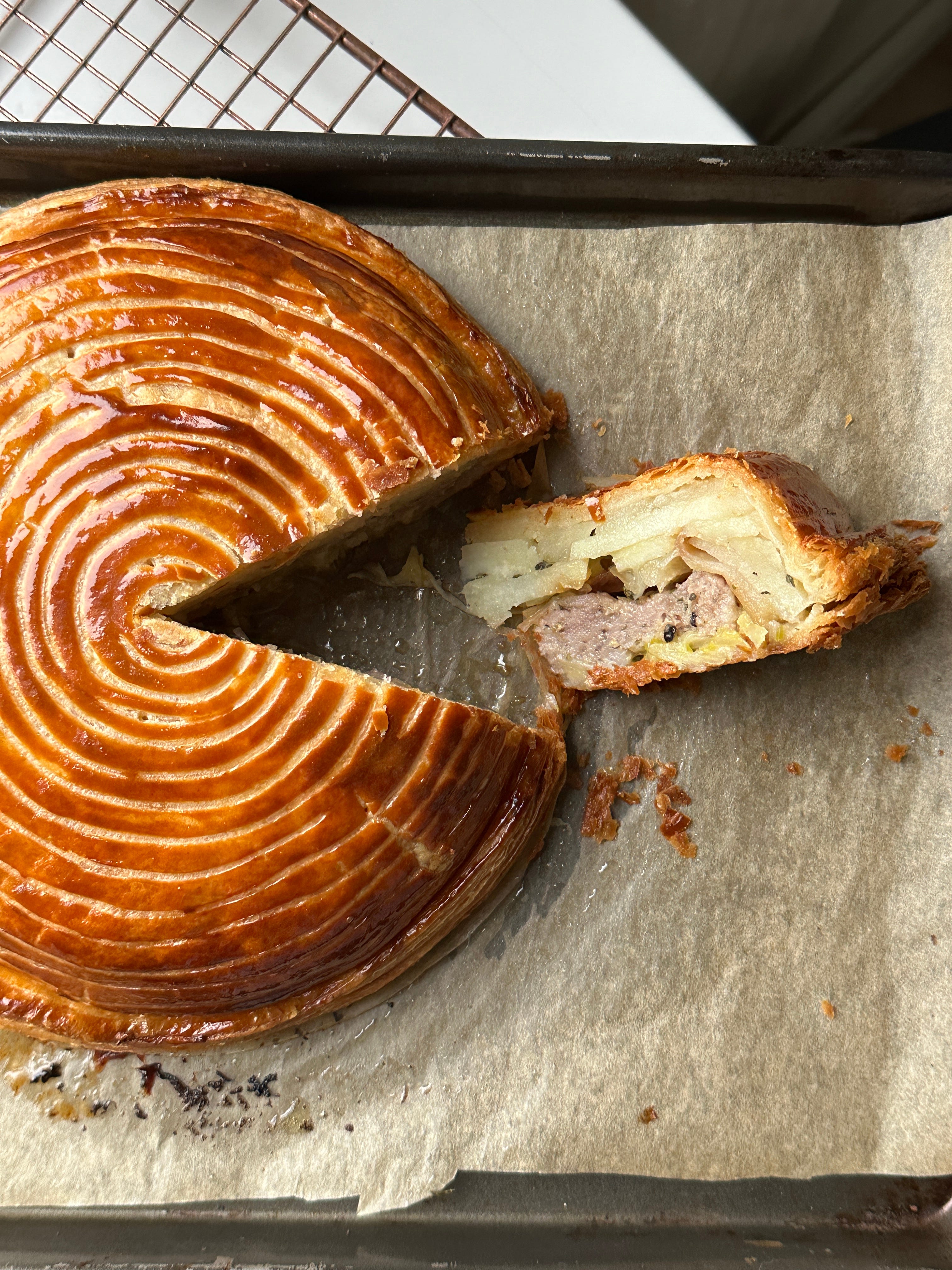 The sausage part was the most challenging bit. I decided to use Cumberland sausagemeat, removing it from the casings, rather than pork mince. I chose to do this because it is already pre-seasoned (nutmeg, pepper, sage and salt for the win), and good quality was easily accessible - by all means, if you don’t have a good butcher nearby, use good quality pork mince and season yourself. But placed raw into my pithivier, it shrank during the bake and became overly firm and dense. Remember that 50-minute cooking time? It’s about 30 minutes longer than sausages are happy to be cooked for.