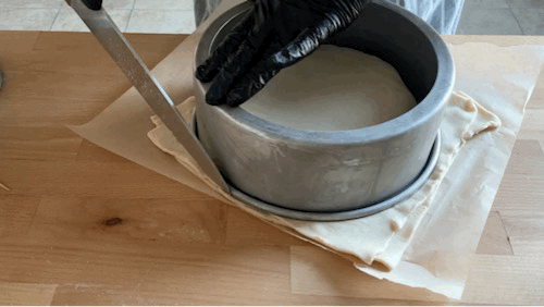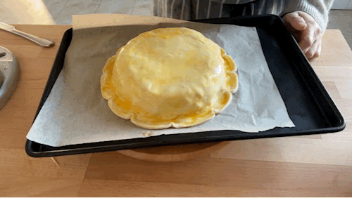 Rest in the freezer for 10 minutes. Choose a round cake tin which is slightly larger than the hump of fillings - a 1-inch border is best. Then, trim the excess pastry using a sharp knife and the tin to guide you. If desired, use the back of a knife or toothpick to make indentations around the pastry and create a scalloped edge for your pithivier.
