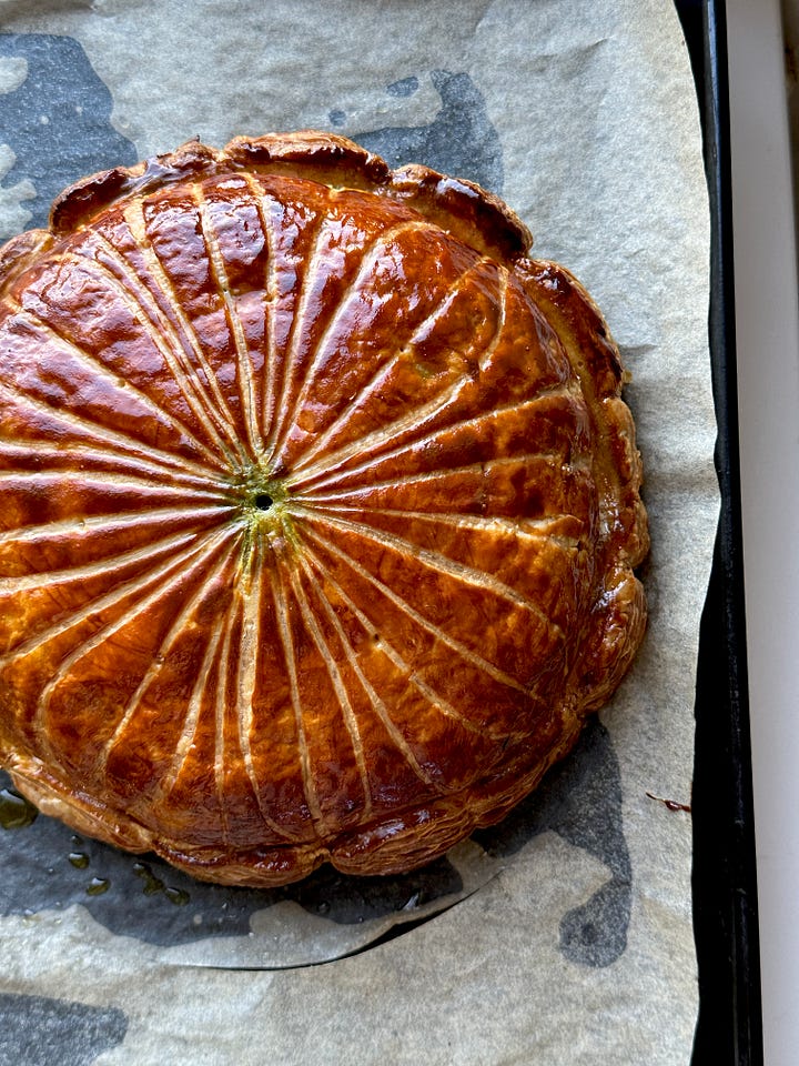 Score the galette with a toothpick or light, sharp knife. Don’t score the pastry - score the chilled egg wash for the best look. You can use a cake turntable, if you have one, to help with the scoring. Stab a few vent holes in the pastry with a toothpick to allow steam to escape. Rest for 10 minutes in the fridge before baking to chill and relax. You can also leave it in this pre-baked state in the fridge overnight, though the wet filling will start to play havoc with the pastry.