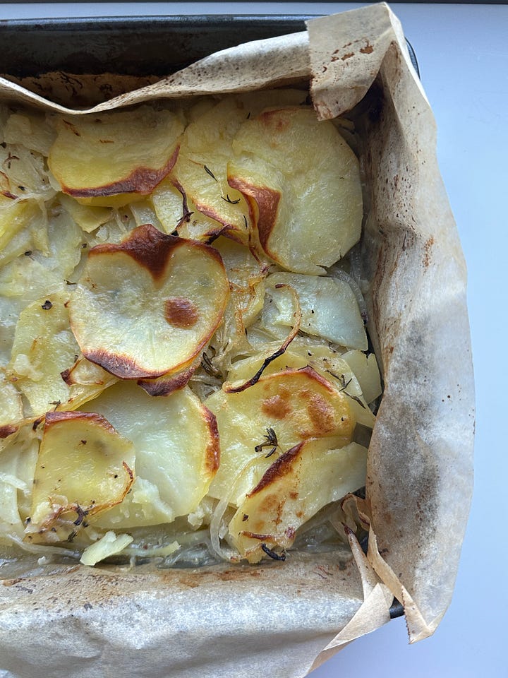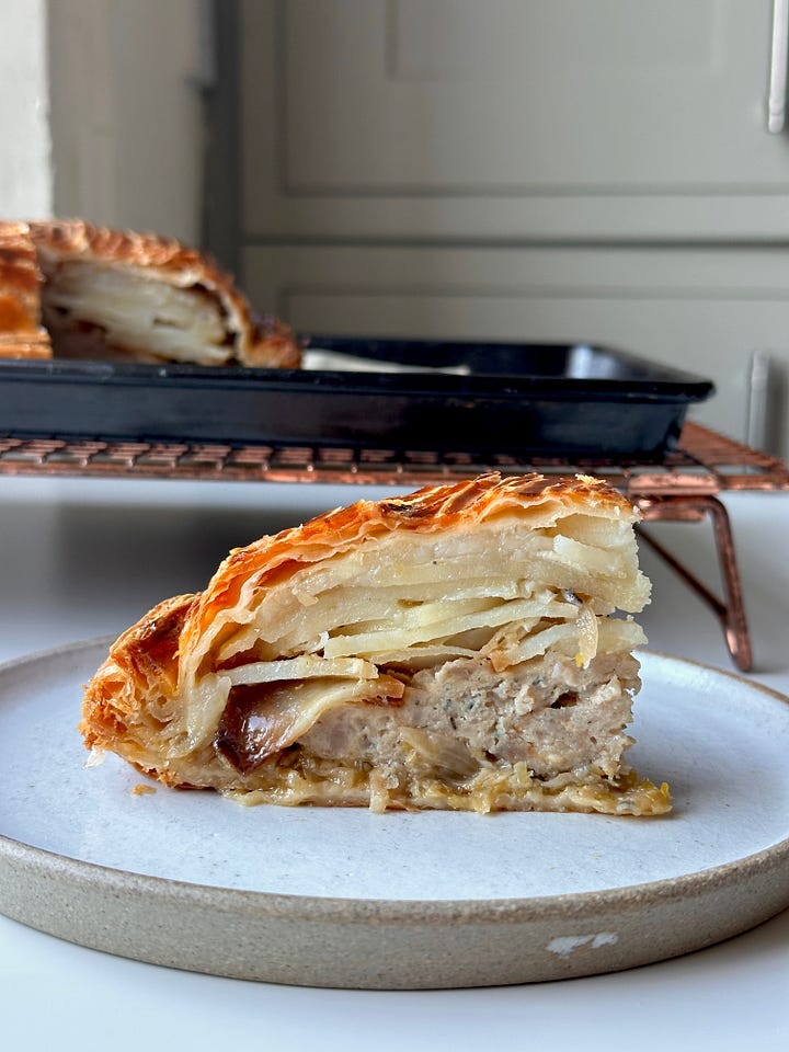 The potato layer was relatively simple to design, too. Though dauphinoise-style pies are well-documented and gorgeous in their own right, I wasn’t after something creamy. For me, the pastry brings the buttery, rich element, so I wasn’t after creamy potatoes. Enter: ‘Pommes Boulangére’. Boulangére potatoes, named for their origin of being cooked slowly in cooling bread ovens at the bakery, are a type of layered potato that is cooked with stock rather than dairy. For this recipe, you have two options - if you have a 7-inch round dish, the perfect size for our 8-inch pithivier, you can cook the potatoes in here, chill overnight, and then simply turn it over onto your pastry. If not, you can cook in an 8-inch square dish, cut out the 7-inch round, and place it on gently, in pieces if needed. Both work well, though you do have to hold your nerve a bit!