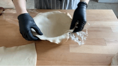 Divide the pastry roughly into ⅓ and ⅔. The larger piece will line your dish, and the smaller piece will be the base. Use a measuring tape to check the larger piece will fit in the base and up the sides of your chosen dish before cutting.