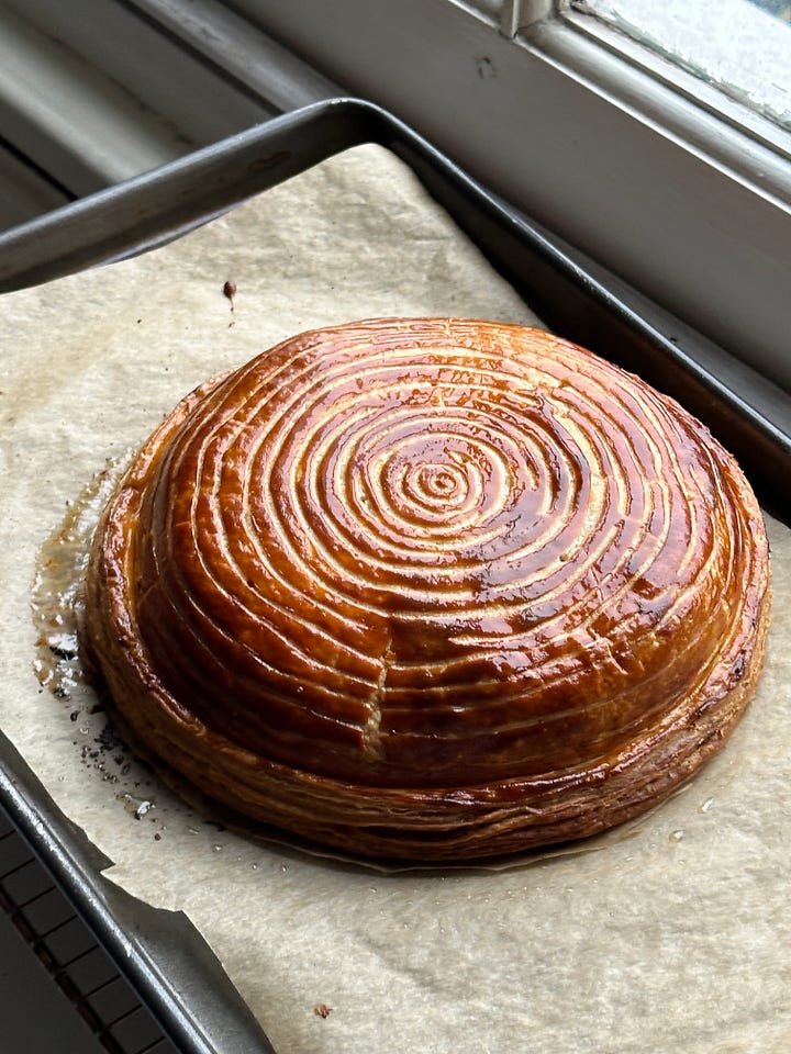 While decorative pastry, like shapes or latticing, are gorgeous, that is a subject for another day. For today’s pithiviers, I’m using the classic double egg wash (yolks only!), then score. Applying egg wash correctly is a bit of an art - you want it to be thin and even, but several coats with a period of drying in the middle. If you wash too much egg, your pastry will be very soft after baking.