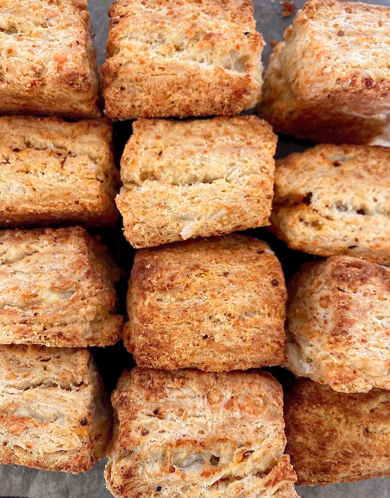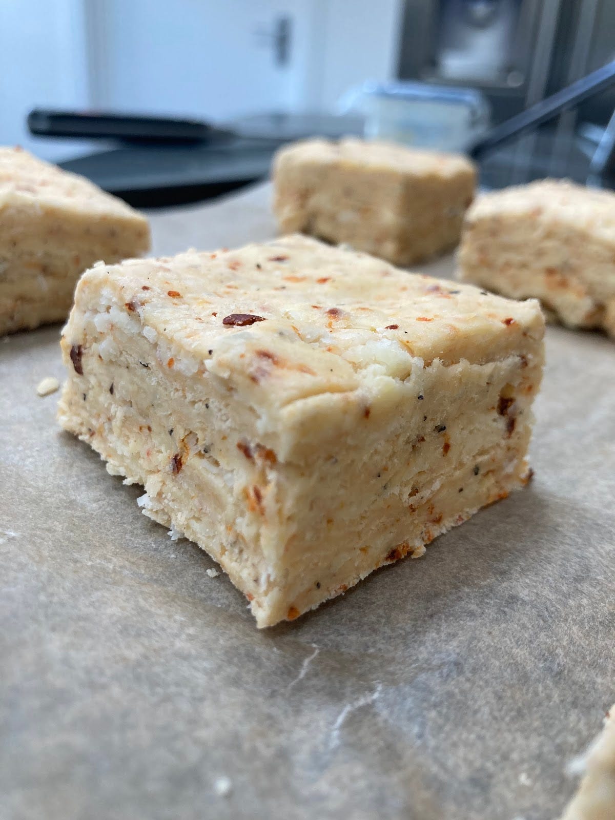 Now, I bloody love a cheese straw. I love the way the puff pastry shatters and I think they have the perfect salt content. So, I set out to translate all the best bits of those but with the added tenderness of a scone, and hopefully with some gooey cheese pockets throughout.