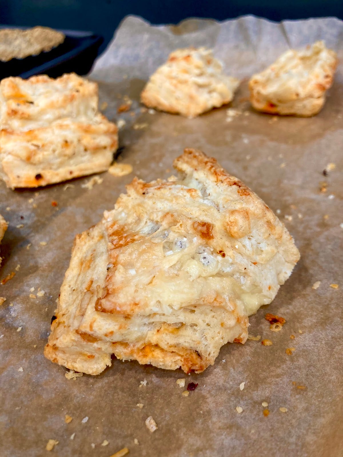 For the cheese, I decided on a two-pronged approach – ultra mature cheddar and parmesan. That being said, any cheese would work well here, so long as you watch the hydration AND be aware of the salt content – nothing too gooey too early, and if you go ultra salty then watch how much flaky salt you add! The first time I made the scones, they simply weren’t cheesy enough which was totally not appropriate. A cheese scone really ought to make an impression on the palate! So, I upped it to a rather more generous 50% of flour weight. Much better.