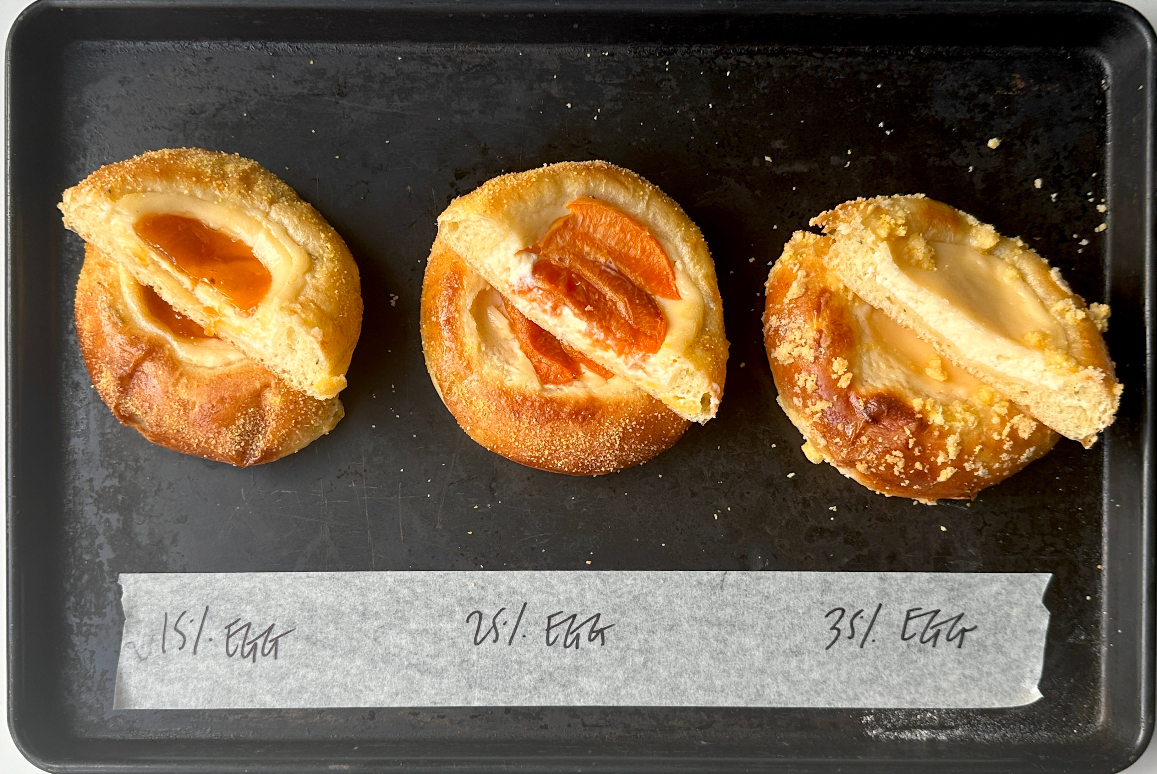 The cooking method matters too. Custard Tart, for example, can handle a high egg-to-cream ratio because it’s baked at a low temperature, which helps avoid curdling. So what of my brioche tarts? A small piece of brioche cooks in just 12-14 minutes on a relatively high heat, so I needed a custard ratio that was compatible with that cook time, ideally avoiding curdling. I mixed up three tests: 15%, 25% and 35% eggs to dairy. This was also pre-blackberry pivot, so I was also testing out various jam/topping combinations to compare and contrast: