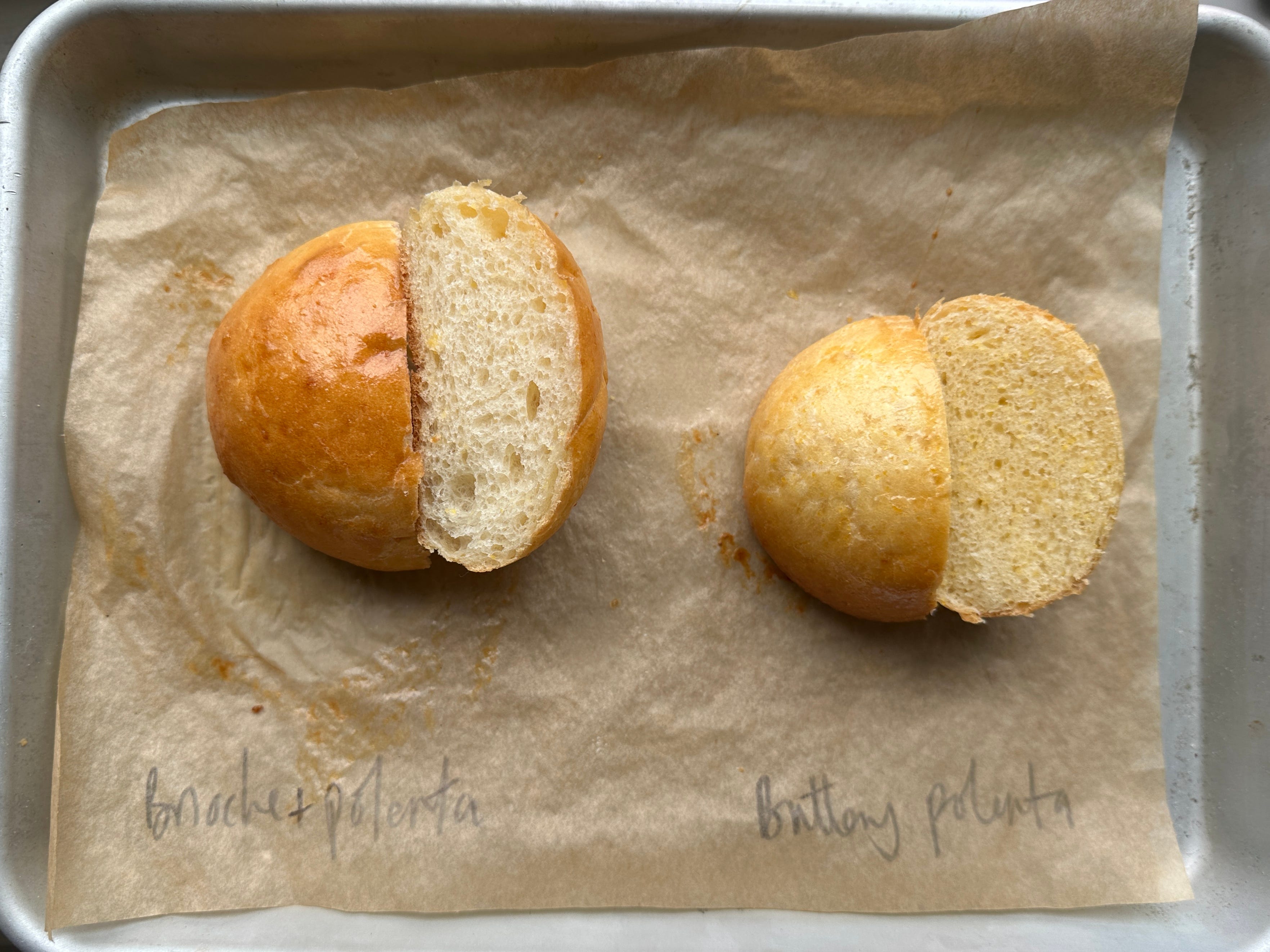 Once proofed and baked, the same weight of dough made drastically different buns. The buttery polenta dough had a tighter, richer crumb and didn’t rise very much, while the version based on brioche was ultra airy.