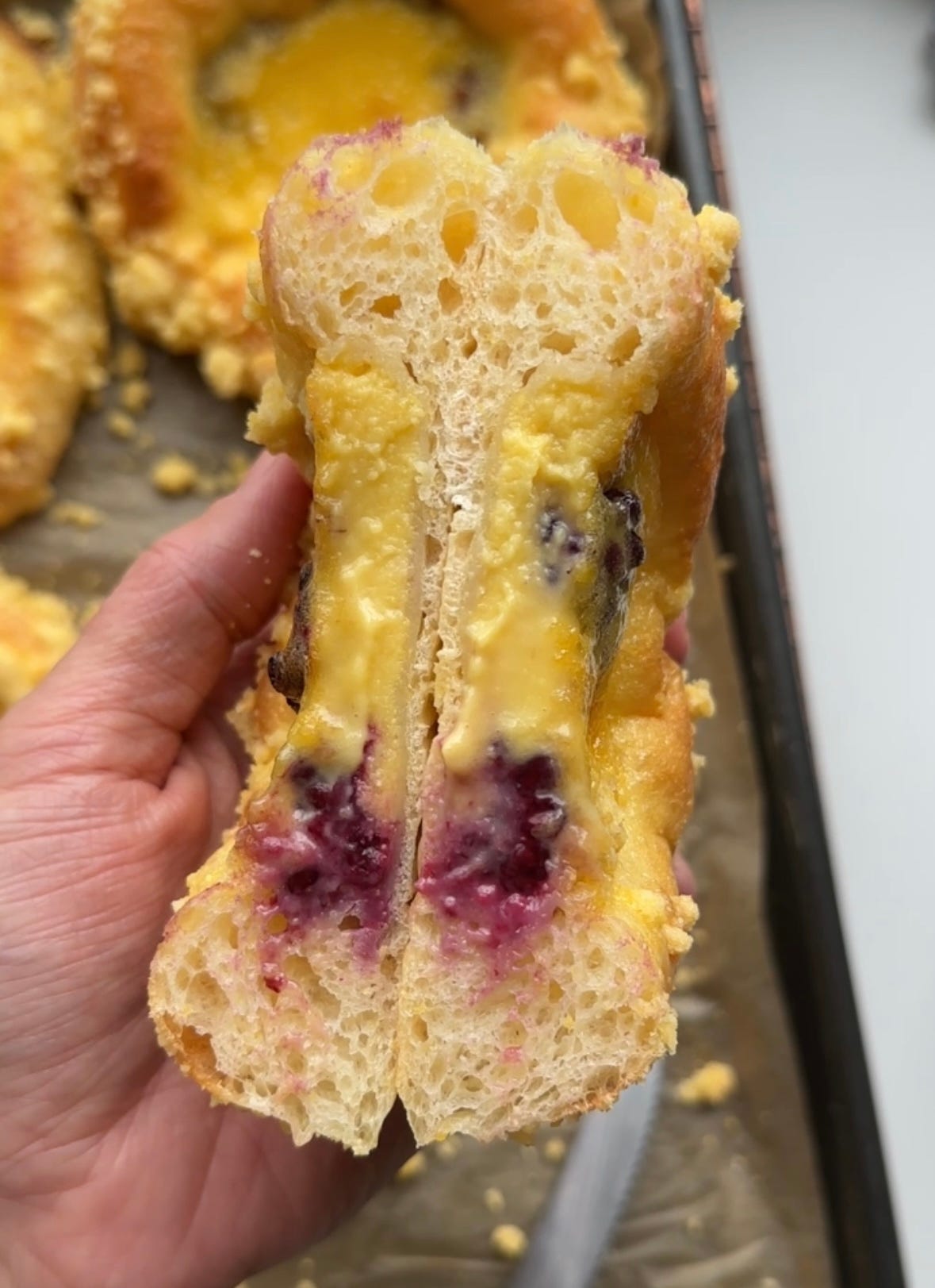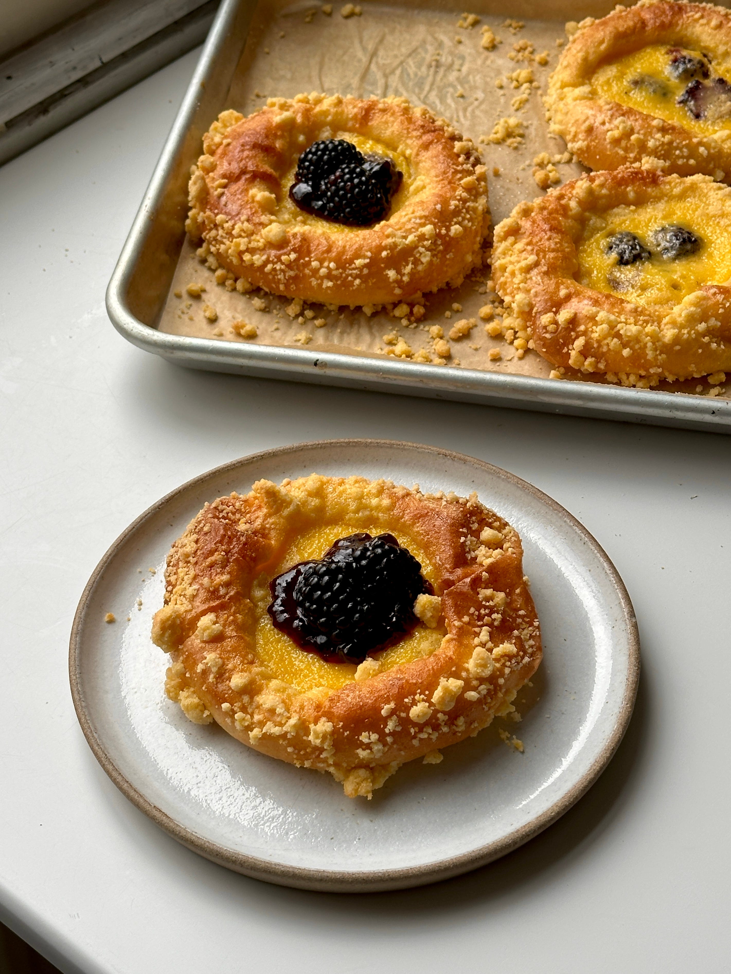 Today I had a bit of a boomerang with the direction of the newsletter: Where we begin is not exactly where we end. But the ending is good: Triple corn brioche tarts, with a sweetcorn custard cradled by buttery polenta brioche, a cornmeal-enriched crumb and juicy, bright blackberries to contrast.