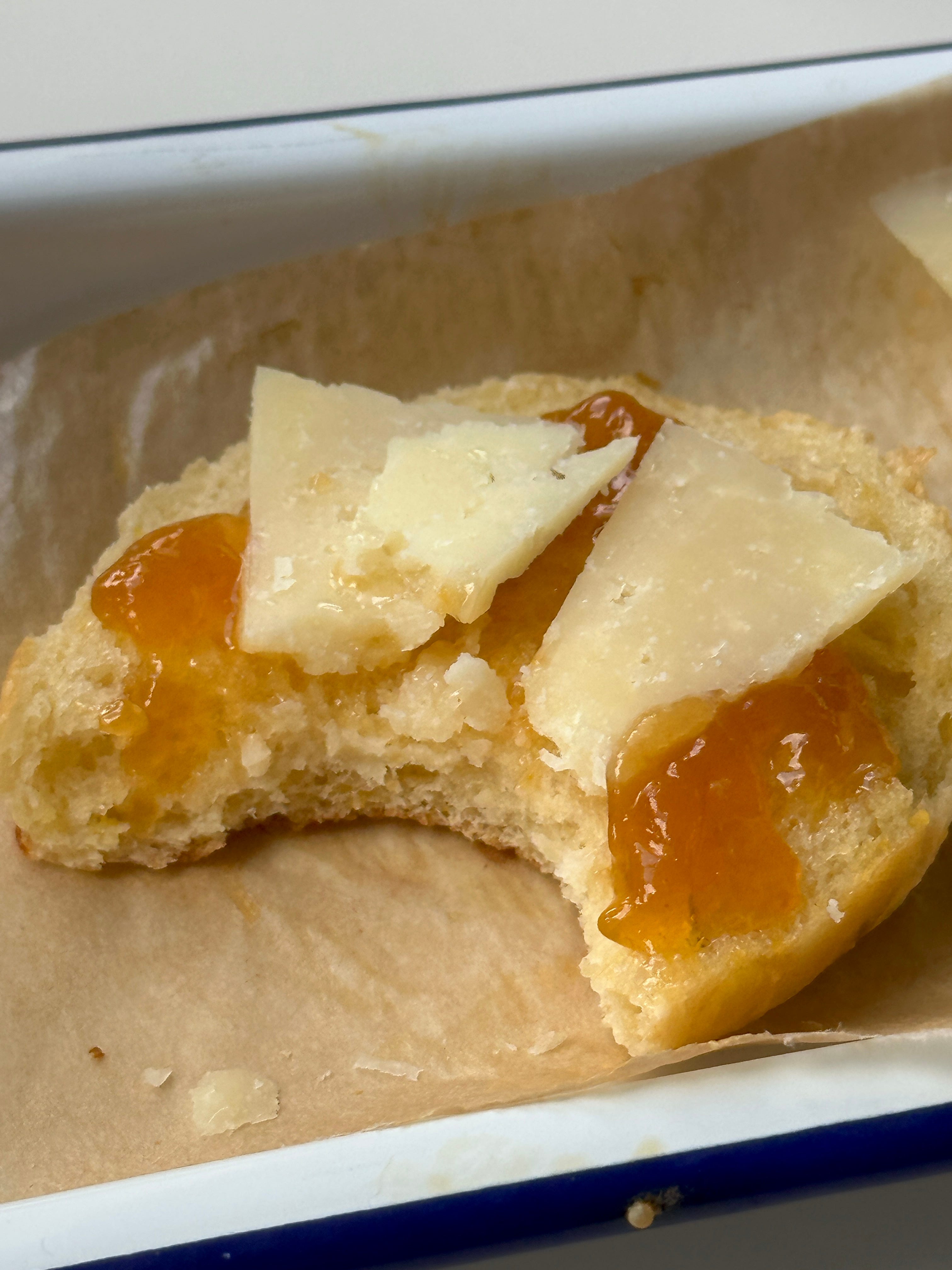 As you know from reading the intro of the piece, I started by pursuing an olive oil, polenta and rosemary flavour scheme. These made delicious buns, and I particularly enjoyed a manchego little sandwich with apricot preserves - but they fell short in the brioche tart format. I was envisioning some kind of tangy cream cheese custard in the base to complement the savoury dough, with plenty of apricot preserves on top. But in practice, the combination fell short. It just didn’t flow.