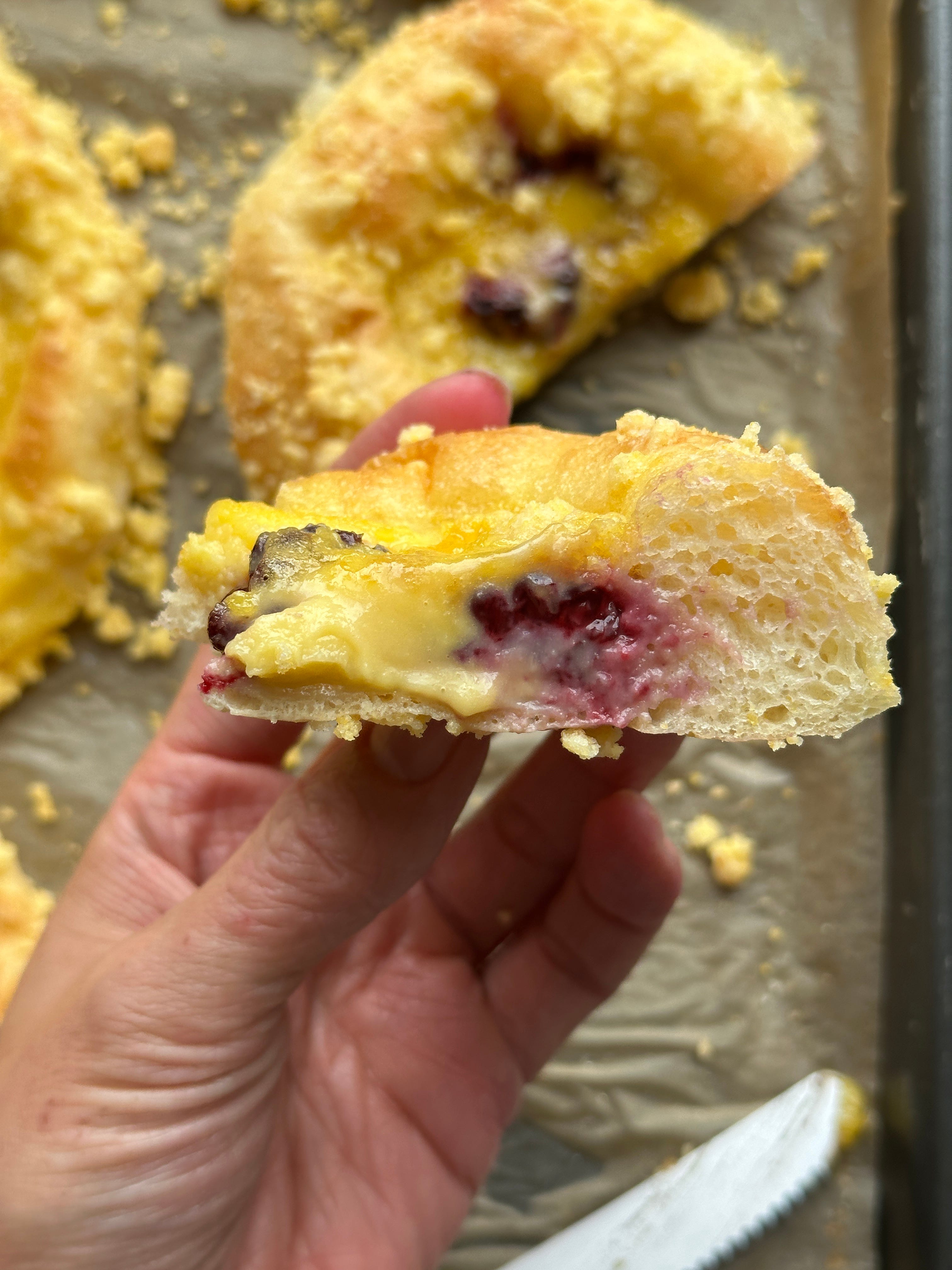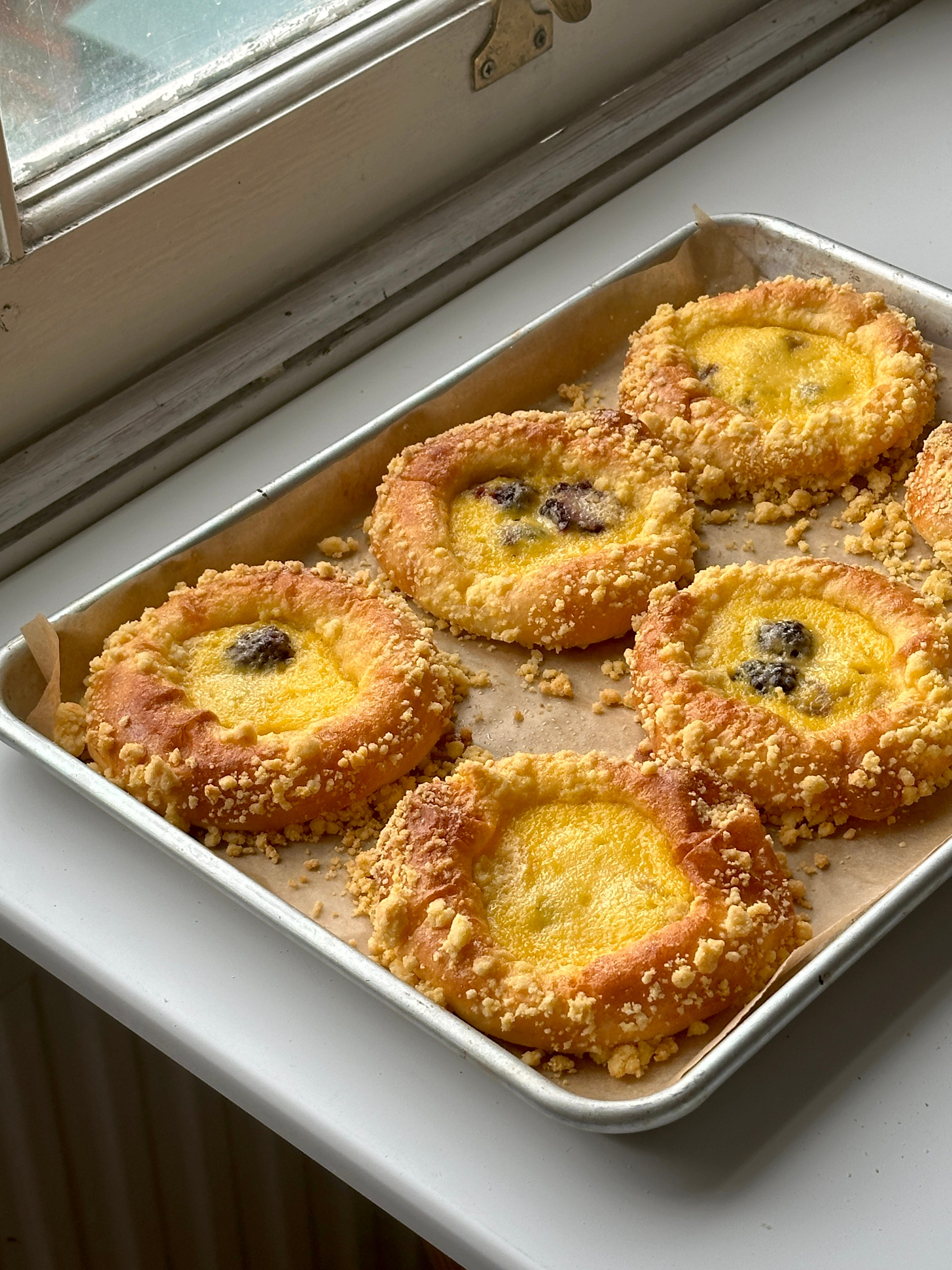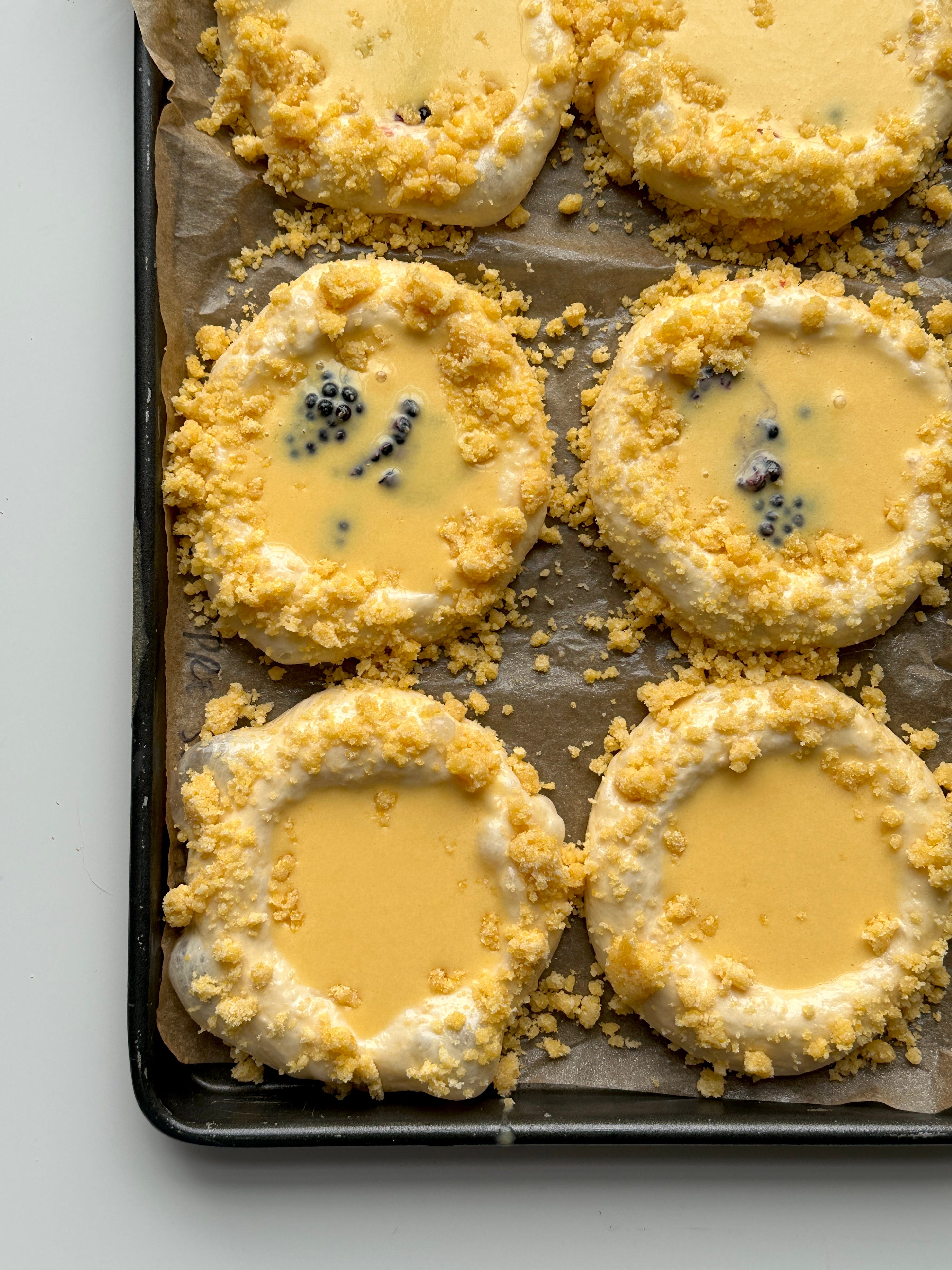 Although this tart with fresh blackberries in the base, sweetcorn custard and that soft, airy polenta dough was already beautiful, I couldn’t help but wonder… wouldn’t a crumb be REALLY nice? I think crumbs are a cheat code in the baking world. They take about 20 seconds to prep (team melted butter method every time!) and they add so much character and flavour. This one with cornmeal is delightfully gritty - in a good way, y’all, don’t freak out! - and looks beautiful scattered on the egg-washed bun.