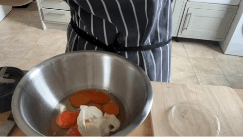 So, for today’s recipe, we’re using a combination of whole eggs and yolks - two whole and three yolks, to make about 150g of egg total.
