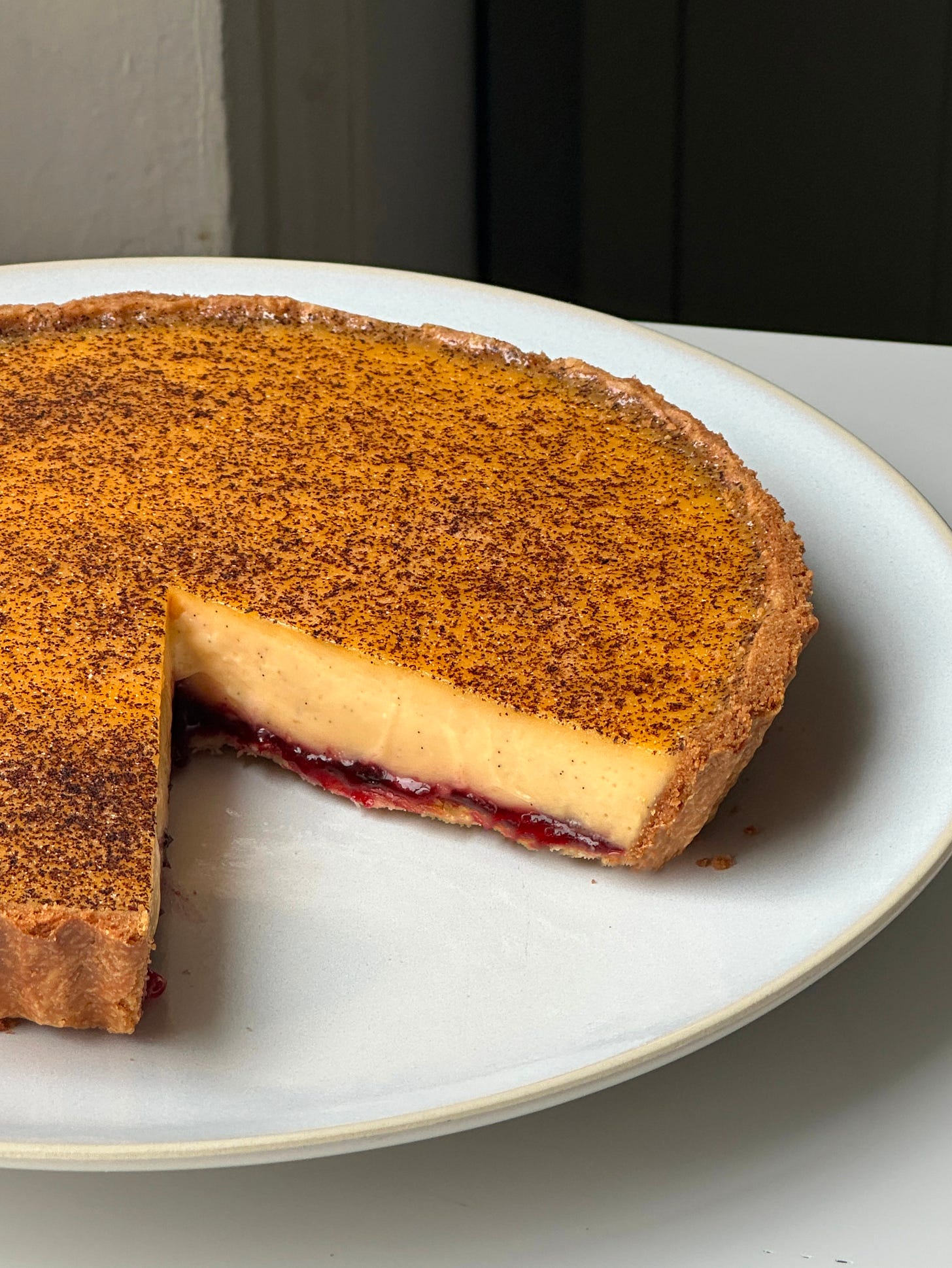 For the classic tart, I’ve added a layer of jam, baked into the case til sticky to prevent it floating up during the low and slow section of the bake. But over on KP+, it’s a level-up.