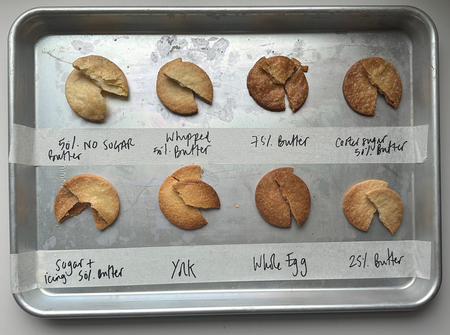 The most standard mix, 50% butter to flour, a little salt, and just enough water to bring it together, was a little charmless, though not bad at all. At the other end, 75% butter made for an intensely rich and buttery dough, but one that was frustratingly fragile. 25%, as you can imagine, felt a bit mean. Creaming the butter created a dough that was more even but less airy; it lacked the crumbly mouthfeel I wanted. Adding eggs took things in another direction entirely: yolk and whole egg gave a rich flavour, with the yolk-only dough so short it dissolved instantly in the mouth — lovely as a standalone biscuit, but over the top for the classic shortcrust I was aiming for.