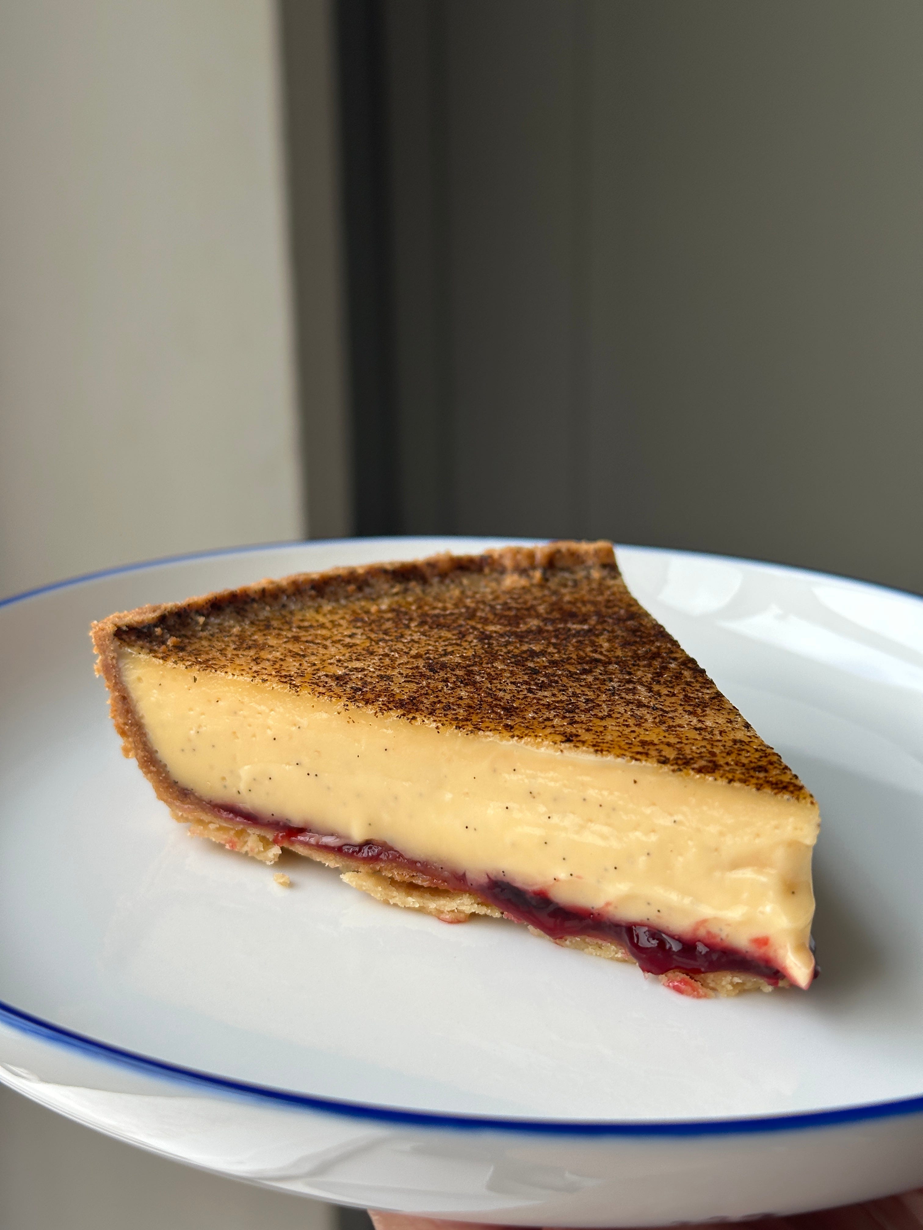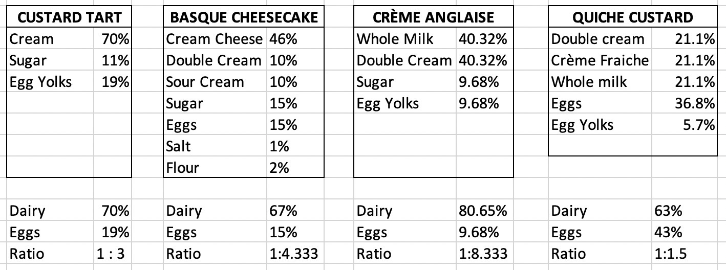 Custards set as the proteins in the eggs harden (coagulate). The more eggs you have, the firmer the set. Considering the ratio between eggs and dairy is crucial to achieve the desired set. For crème anglaise, aka pouring custard, the egg to dairy is about 1:8. In the case of custard tart, a much firmer, denser and richer wobble of a custard, it is 1:3. In Basque cheesecake (yes, cheesecake is a custard!), it is approximately a 1:4 ratio. My quiche custard is closer to 1:1.5.