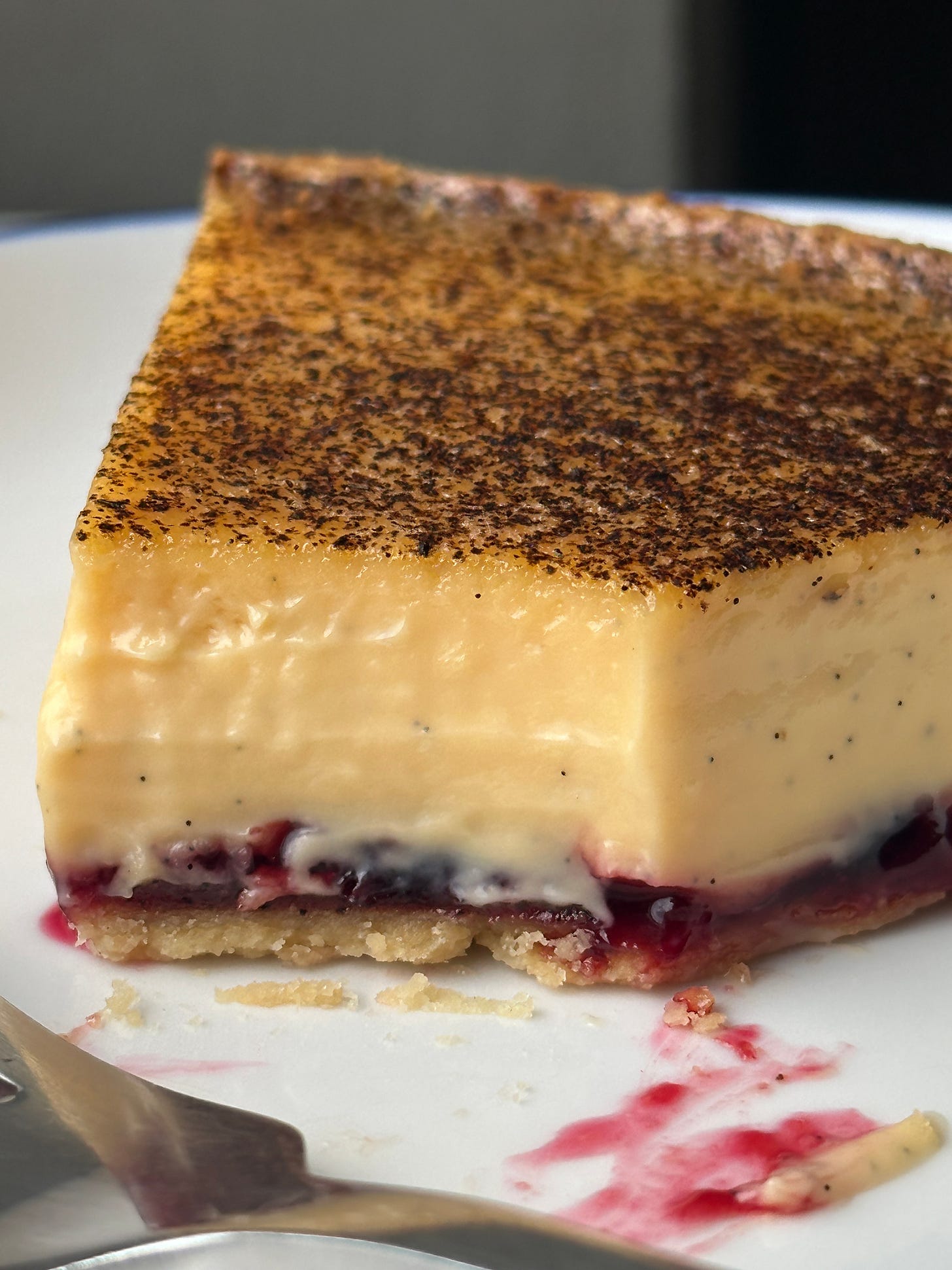 Unsurprisingly, the fattier the dairy, the richer the custard. However, I was still impressed at the performance of the other combinations. Creme fraiche, both acidic and fatty, was just tangy enough to have a ‘je ne sais quois’ special feeling to it, while sour cream and buttermilk were both bright and confident. Whole eggs had a slightly bouncier texture. Cream cheese was indeed thicker but unmistakably cheesecakey - that stuff is surprisingly potent. Though acid has the effect of making something taste more like itself, I found it to be more overpowering than supportive in the ratio I tried. Who knows, perhaps a spoonful would add character, and I suppose the emulsifiers and thickeners used in the cream cheese making process might have stabilising power. That said, I didn’t see a home for it in my classic tart.