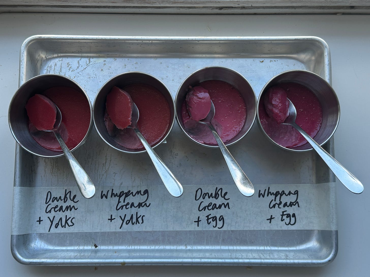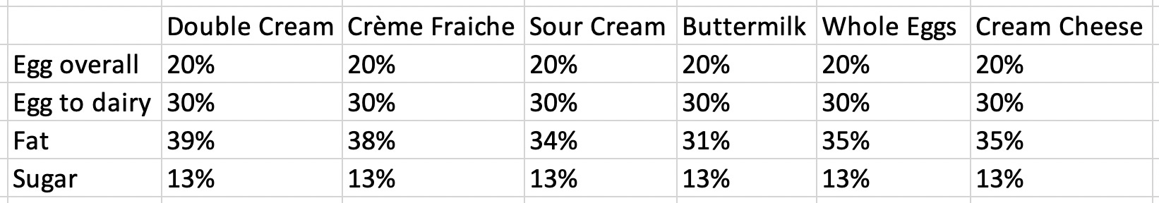 But within a custard formula is a ripe opportunity for adjustment. You have two main levers to pull - the dairy itself and whether you use whole or separated eggs. The final third lever is the ratio and relationship between the dairy and eggs.