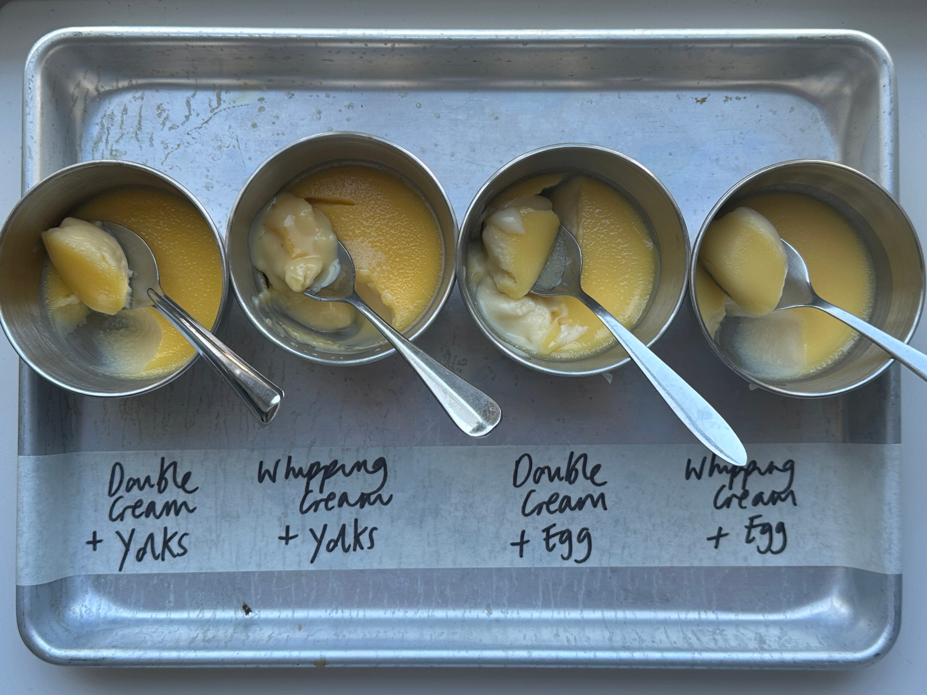 This means really, in any recipe, you can swap yolks for whole eggs gram for gram. The results will be different, but your custard WILL set. It ultimately ends up being about your preference. In all cases, the change from whipping (similar to heavy cream in US) to double cream wasn’t too dramatic - yes, the fattier cream gives you a richer, thicker mouthfeel, but the whipping cream still felt special and decadant.