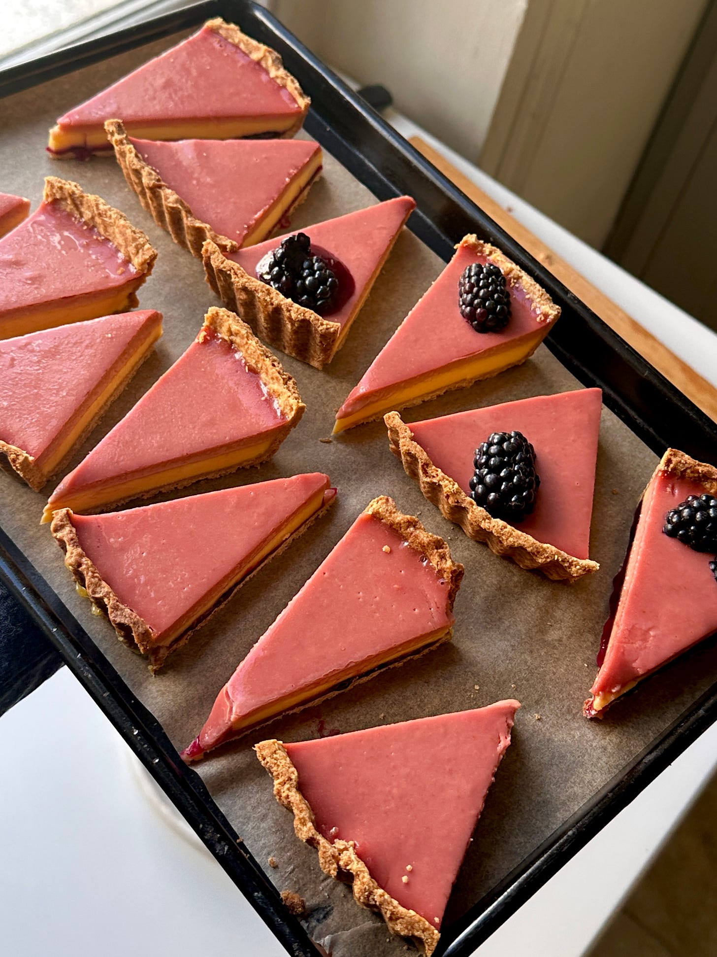 Allow to cool on a baking rack for ten minutes, then trim the overhang of the pastry with a very sharp knife, trimming / sawing in confident strokes along the edge of the tin. Move onto a clean tray (or move the offcuts off) and brush any crumbs out.