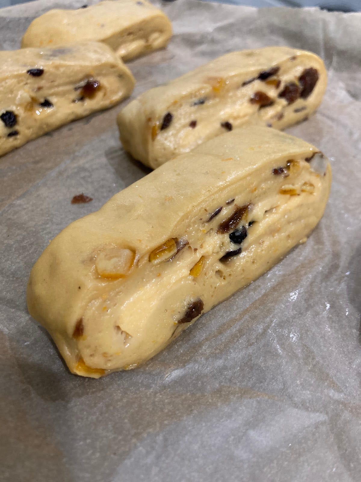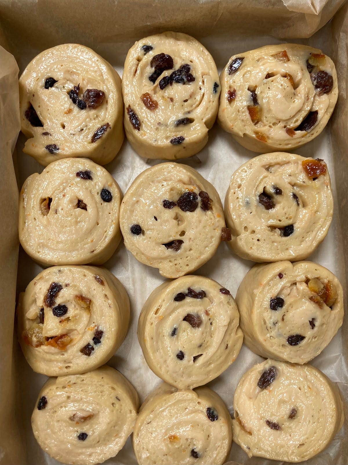 When it was all relaxed and the butter had firmed up (about 30 mins), I rolled it out and covered the dough with my prepped custard, soaked fruit and mixed peel then folded it in two, joining it in the middle. I chilled the whole dough in the freezer so the custard wouldn’t splurge out when cutting into it. This took about 30 mins. I cut and scaled the buns and got them ready to proof: