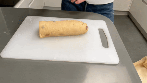 Place your dough rolls in the freezer for 10-20 mins to firm up. You can cut it right away but I prefer to let it chill to keep things neat
