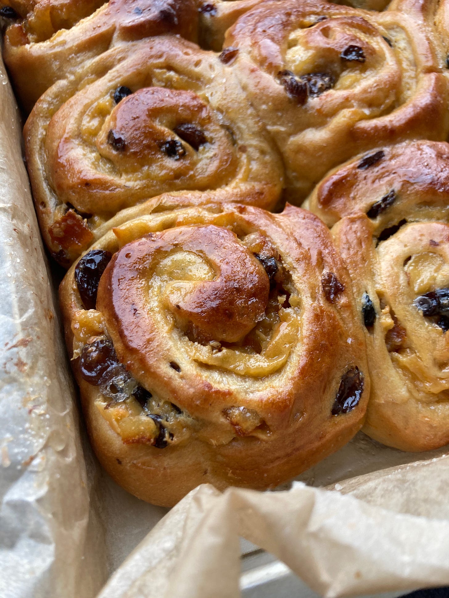 Until these went into the oven, my plan was to simply brush with my peel candying syrup as they left the oven. I really had no intention to glaze them in the style of an American cinnamon roll. But when I saw them all nestled and proofed, I started thinking about whether these would benefit from a frosting sort of thing. Although they already contain custard – which is always the star of the show – I wondered if something bright and light could work.