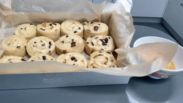 Put greaseproof paper in a 9” x 13” inch tin and place your buns fairly close together. I think rows of 3 work really well in this tin size. You could totally bake these in muffin tins too. That would be adorable.