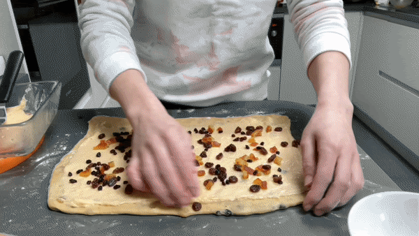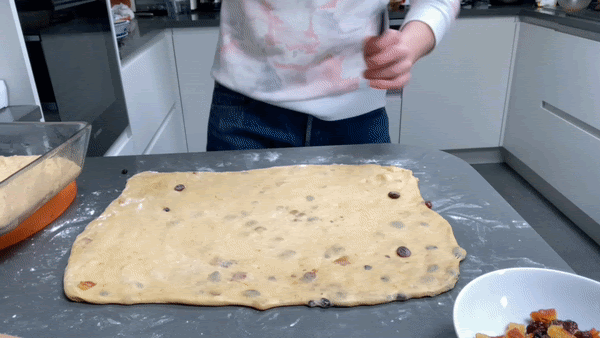 To add the fruit in, stretch the dough quite thin and sprinkle the fruit and peel. Roll it up and then knead the dough into a ball