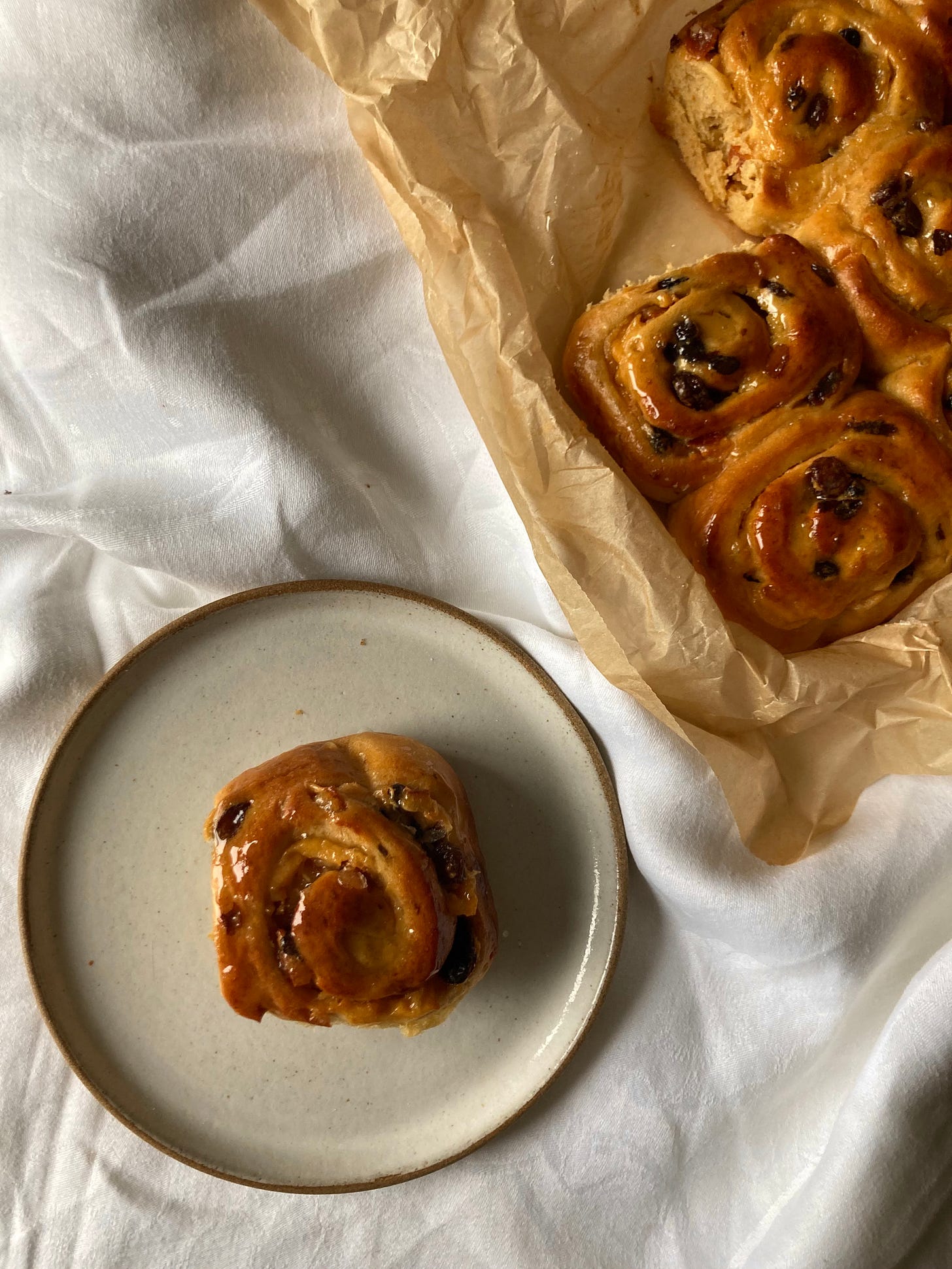 With this in mind: what is hot cross bun adjacent? First I thought about cinnamon buns. I love them, but I wasn’t sure they’d be better with raisins in. I considered a pull apart monkey bread style loaf with a richly spiced sugar but again, I wasn’t convinced about the addition of dried fruit. I thought about an Eccles cake style version where I’d make a buttery raisin-y mixture and then surround it with dough and bake it… but, I wasn’t sure it would work without the flaky, sugary puff shards.