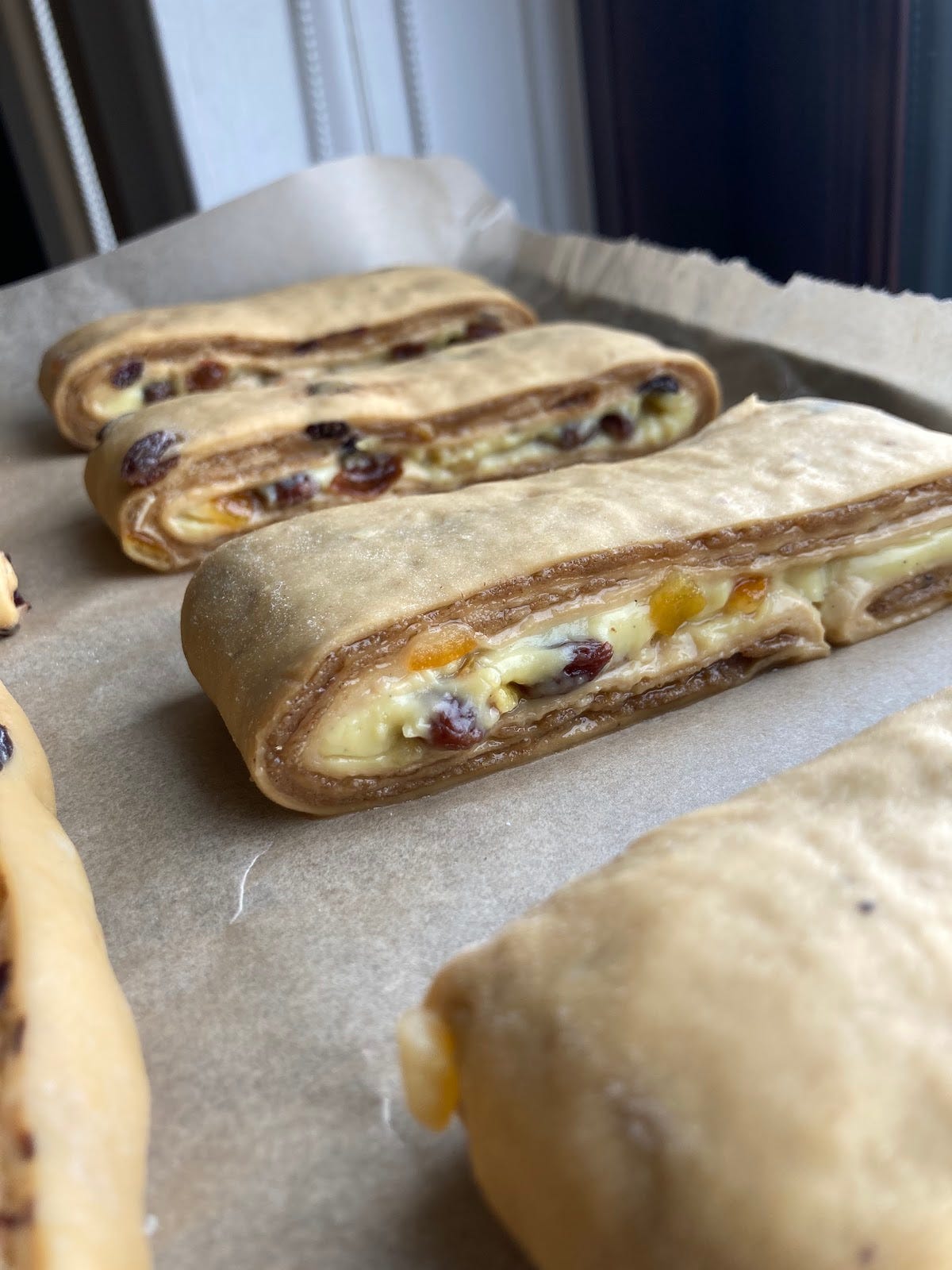 As much as I was loving the pain suisse shape, it wasn’t perfect. So, I wondered if I could get to where I wanted to go by taking inspo from the Pain Aux Raisin shape and swirl it up instead. I’ll revisit the pain suisse sometime in the future…