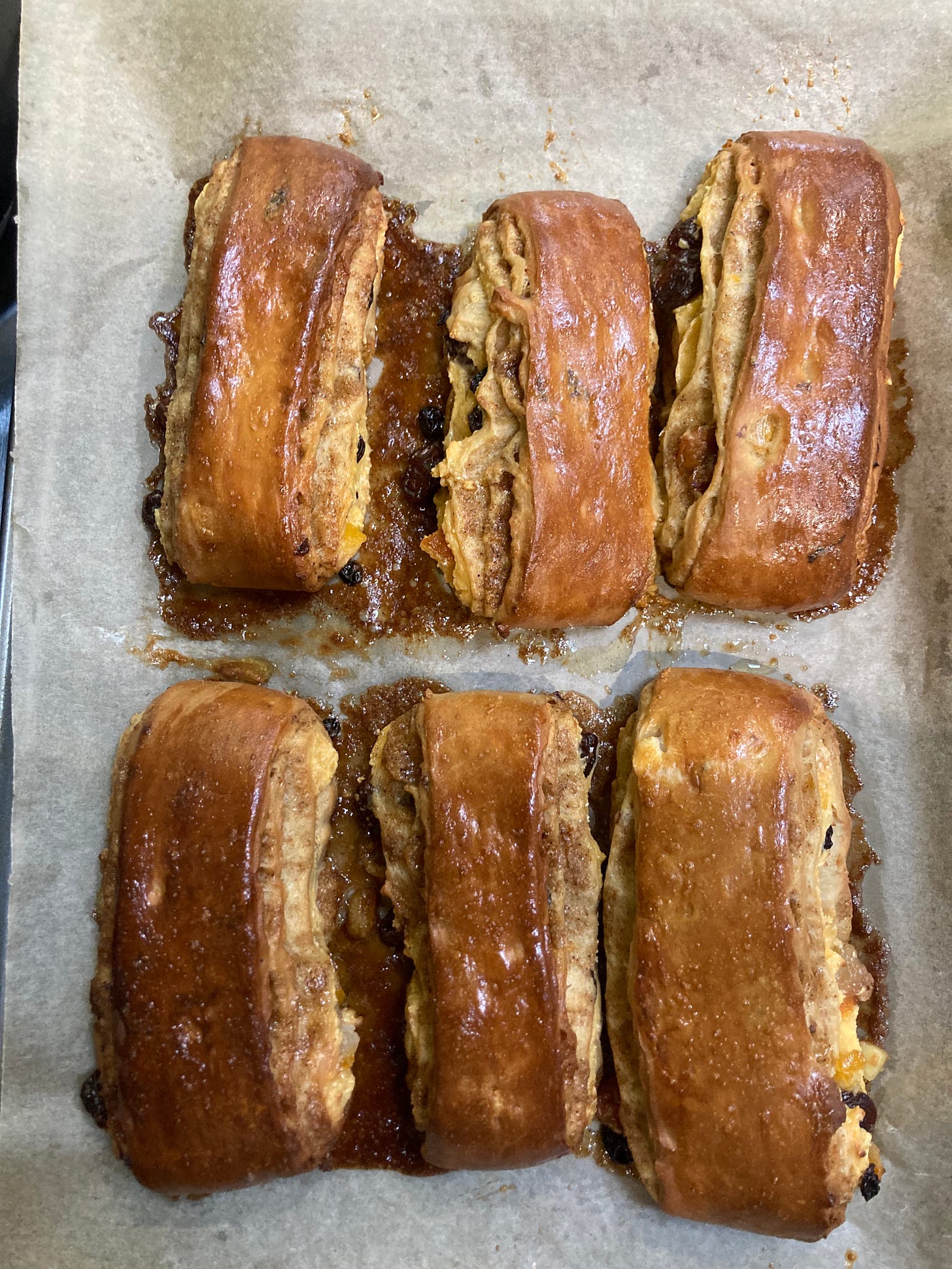 I was SO excited about baking these. Although I was worried that the spiced butter layer might be a bit thick (I was pretty generous and performing only 1 x single fold means the butter is reasonably thick still when it goes into the oven which can lead to major leakage etc.). I umm’d and ahh’d about whether to put a flour cross on it. I figured NOT. It seemed a bit OTT at the time. I baked them for about 18 mins and here’s the result: