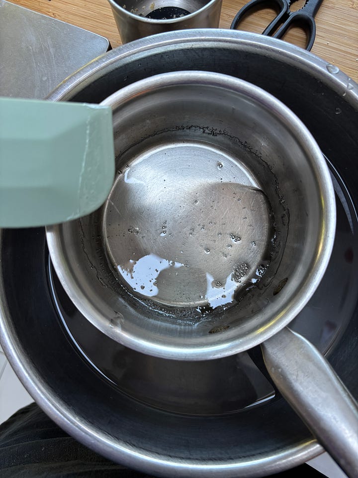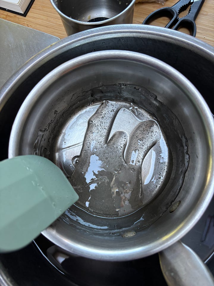 Remove from heat and plunge the bottom of the pot in the bowl of cold water. Stir the mixture until the syrup begins to thicken and turn opaque. It should be the texture of thick honey and a sort of pale silver.