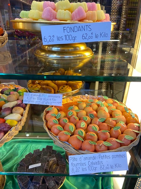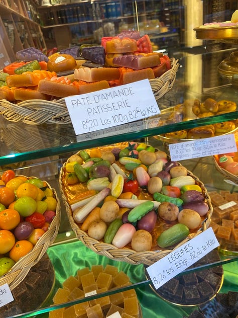 As a child, I’m not sure there was any confection that delighted me as much as marzipan fruits and figurines. At the chocolate shop in the mall, I went straight for the box of marzipan fruits, eschewing the caramels, nuts and fondants. Every year at Christmas what I was most delighted to find in my stocking was a realistic looking marzipan pig with a mushroom in its mouth.
