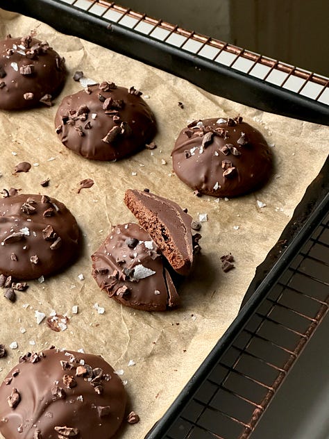 Chocolate Cream Domes (KP+) - buckwheat chocolate cookie with a mound of fudgy cream, covered with chocolate and fancy sprinkles (salt & cacao nibs)
