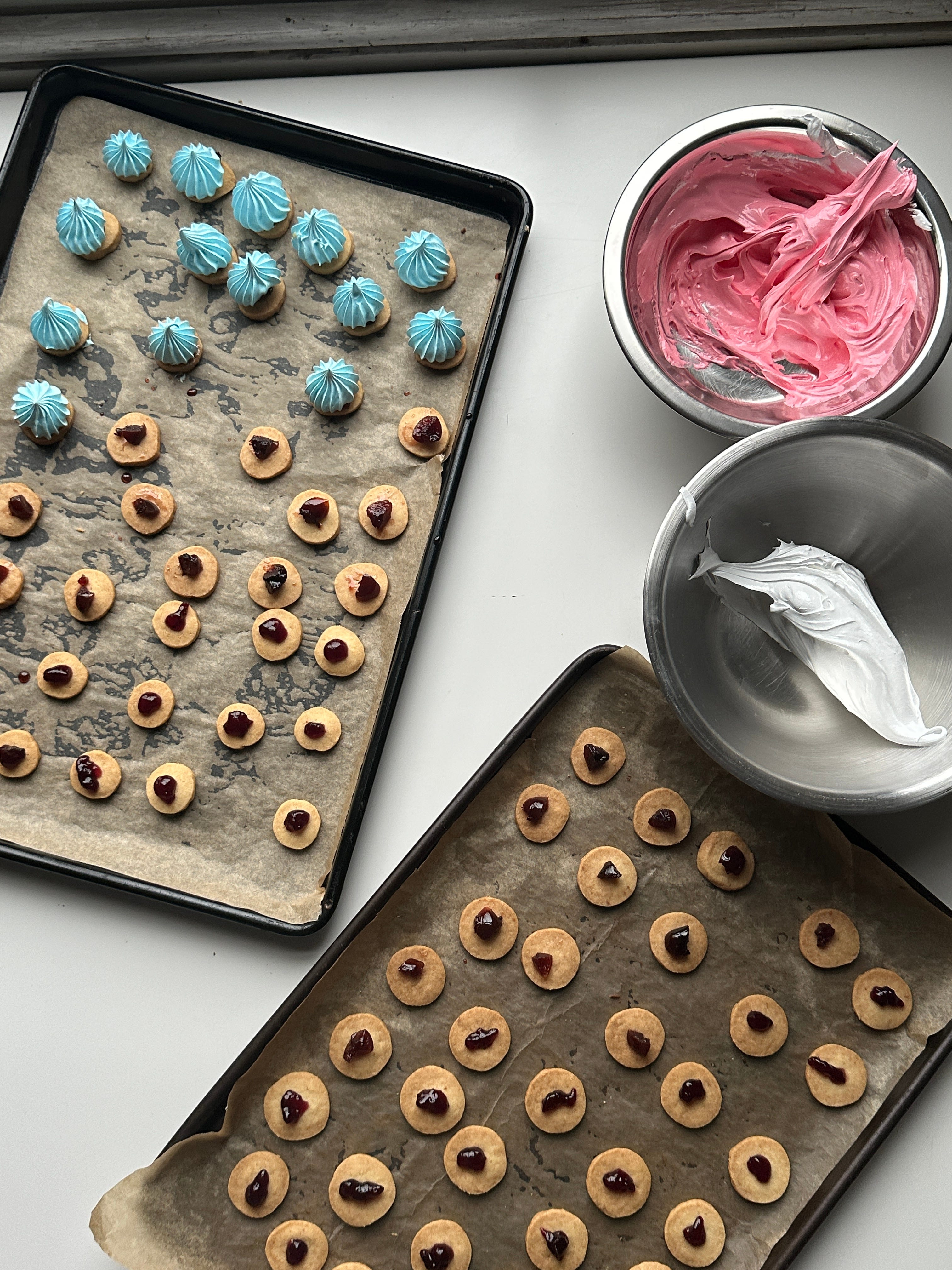 Here, a simple roll, cut and bake shortbread - much more buttery than the original, meets a stiff meringue that is baked til crisp. Meringue has less sugar than royal icing, which helps bring balance to this little cookie. I’ve also hidden a little preserved cherry underneath each star of meringue – this is entirely optional, and is - admittedly - faffy. But it does make these very fun to eat. A little splodge of tart jam (dare I say…. Cranberry sauce?!?! Could be great here, too)