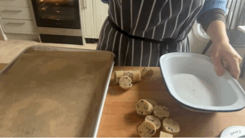 Slice, sugar, and bake: Line two half-sheet pans with parchment and heat the oven to 165C/325F fan/convection (or 175C/350F without fan/convection. Once chilled, roll the dough out to an even log, 28-mm (1 1/8-in.) diameter. (If you find it easier to handle shorter logs, divide the dough into two halves.) Put some sugar in a small bowl. Slice the logs into 19-mm (3/4-in.) cylinders. Dip the top of each cylinder into the sugar, pressing lightly so that it sticks, and arrange them on the lined pans, sugared side up.
