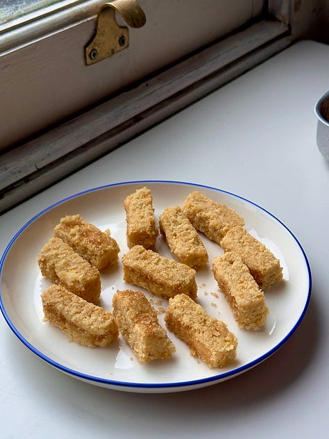 Transfer your sticks to a tray and chill whilst you pre-heat the oven to 160c fan. For larger sticks, bake for 13-14 minutes (mainly go by colour - I like these darker and crisp), or for mini sticks, about 6 minutes.