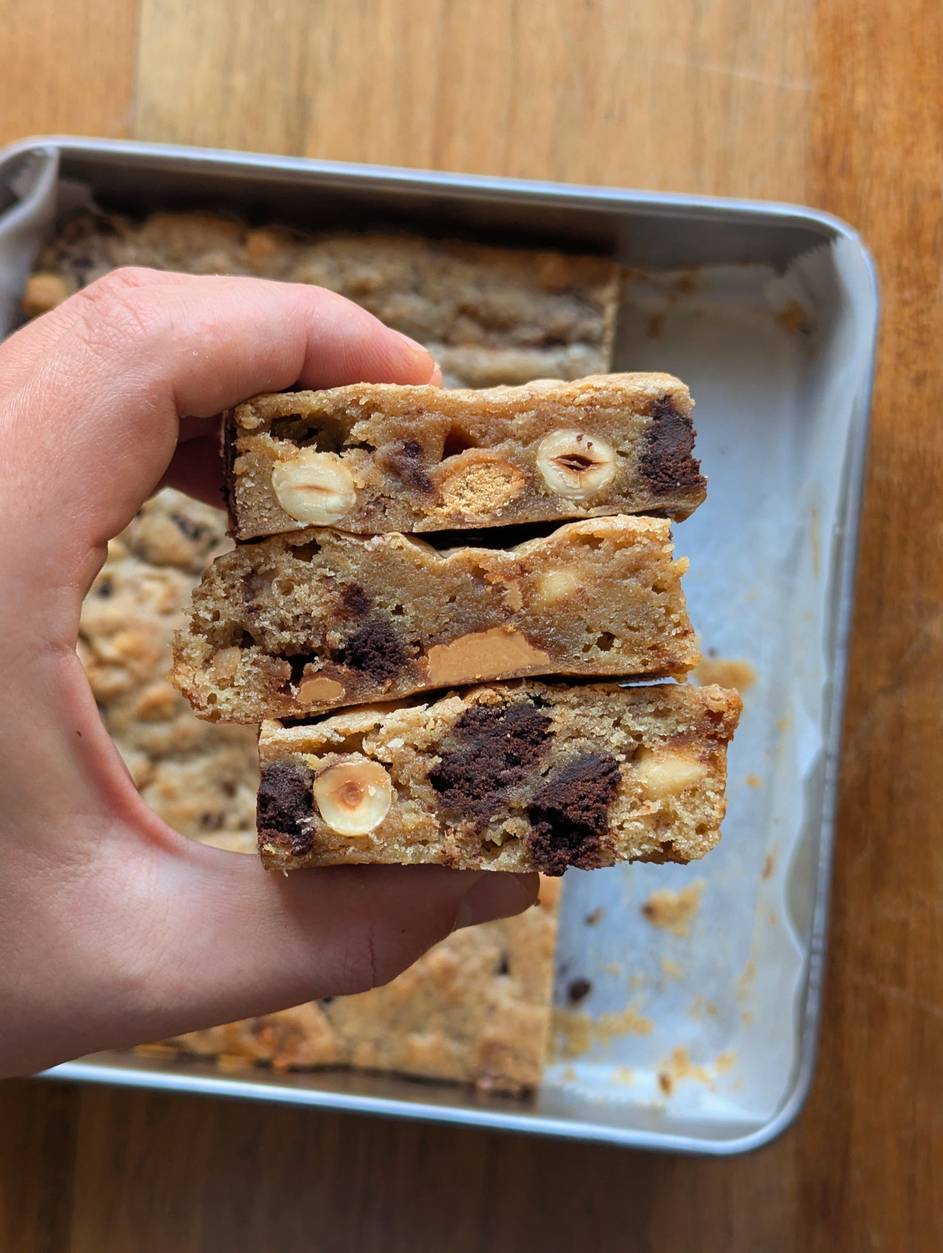 Inspired by Molehill Cake, Piotr has developed a cocoa crumble banana blondie, full of mix-ins with gooey-terrazo energy.