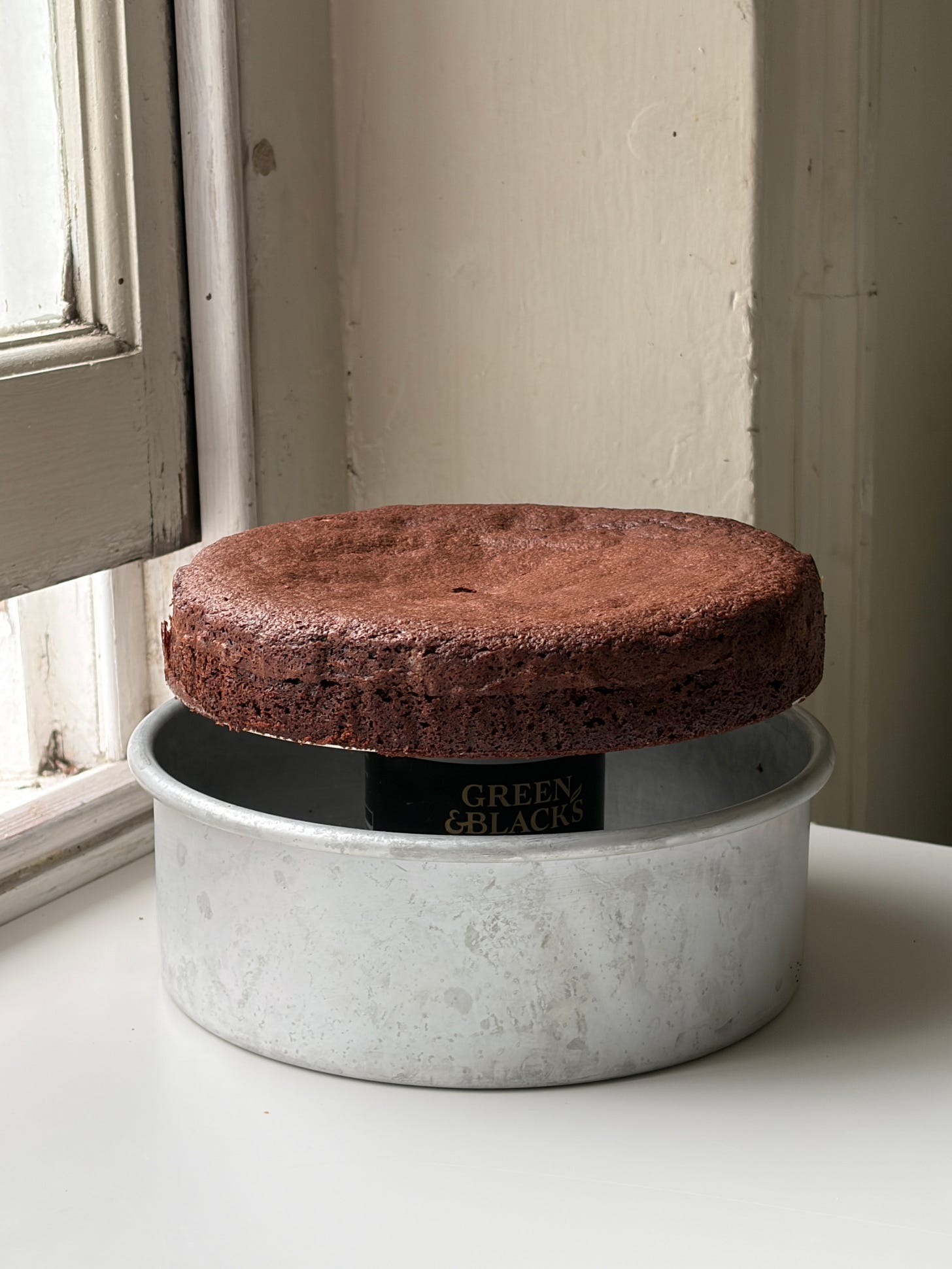 My efforts to simply reduce the liquid resulted in a drier sponge, but with a less pronounced cocoa flavour. To rectify this, I tried replacing some of the oil with butter, which left the cake slightly sunken in the middle but had a good flavour. For the last trial, I added an extra egg to prevent the dent. The result is an evenly baked light sponge that is deliciously chocolatey and dry enough to crumb well (rather than turn into a paste).