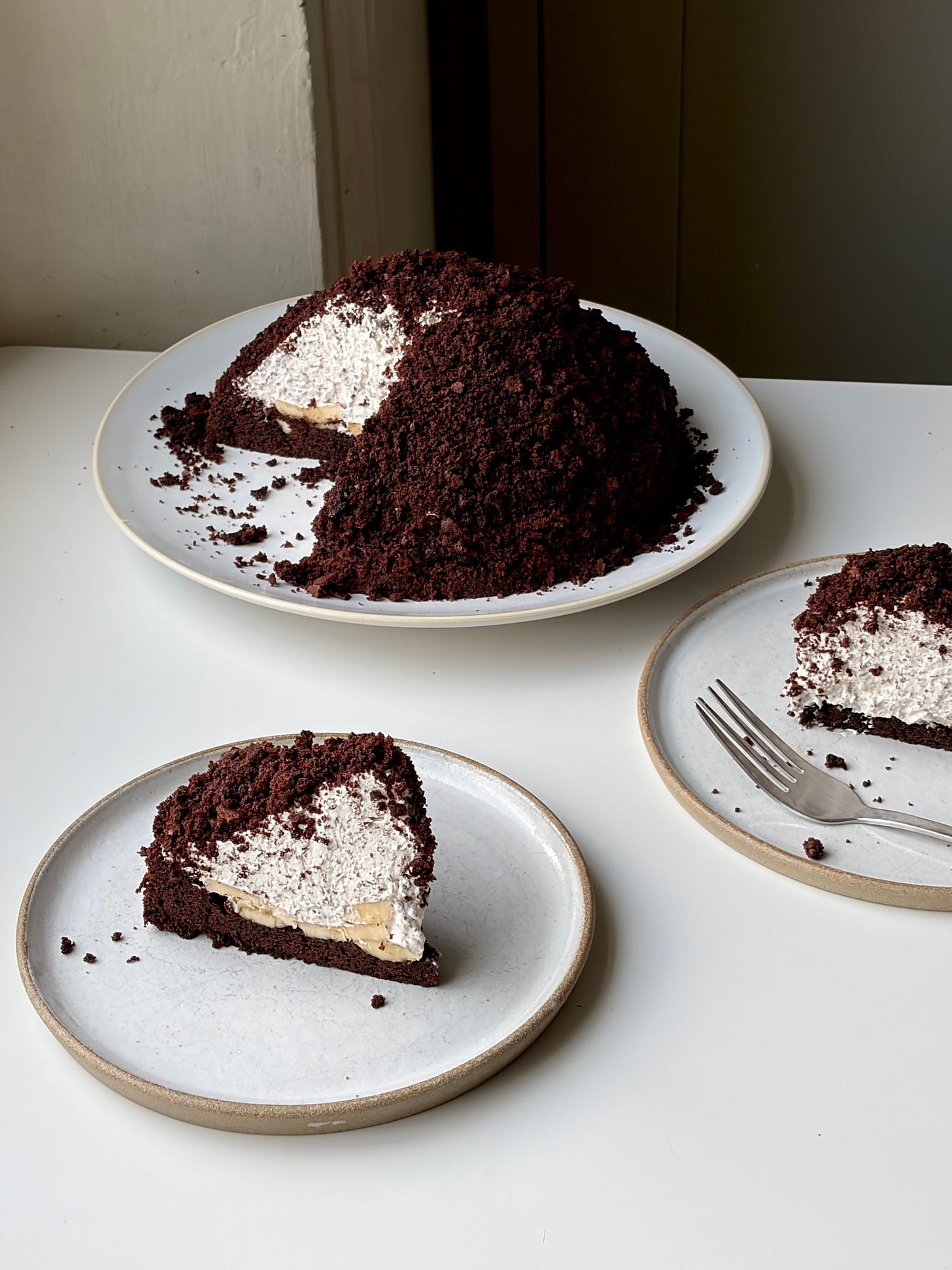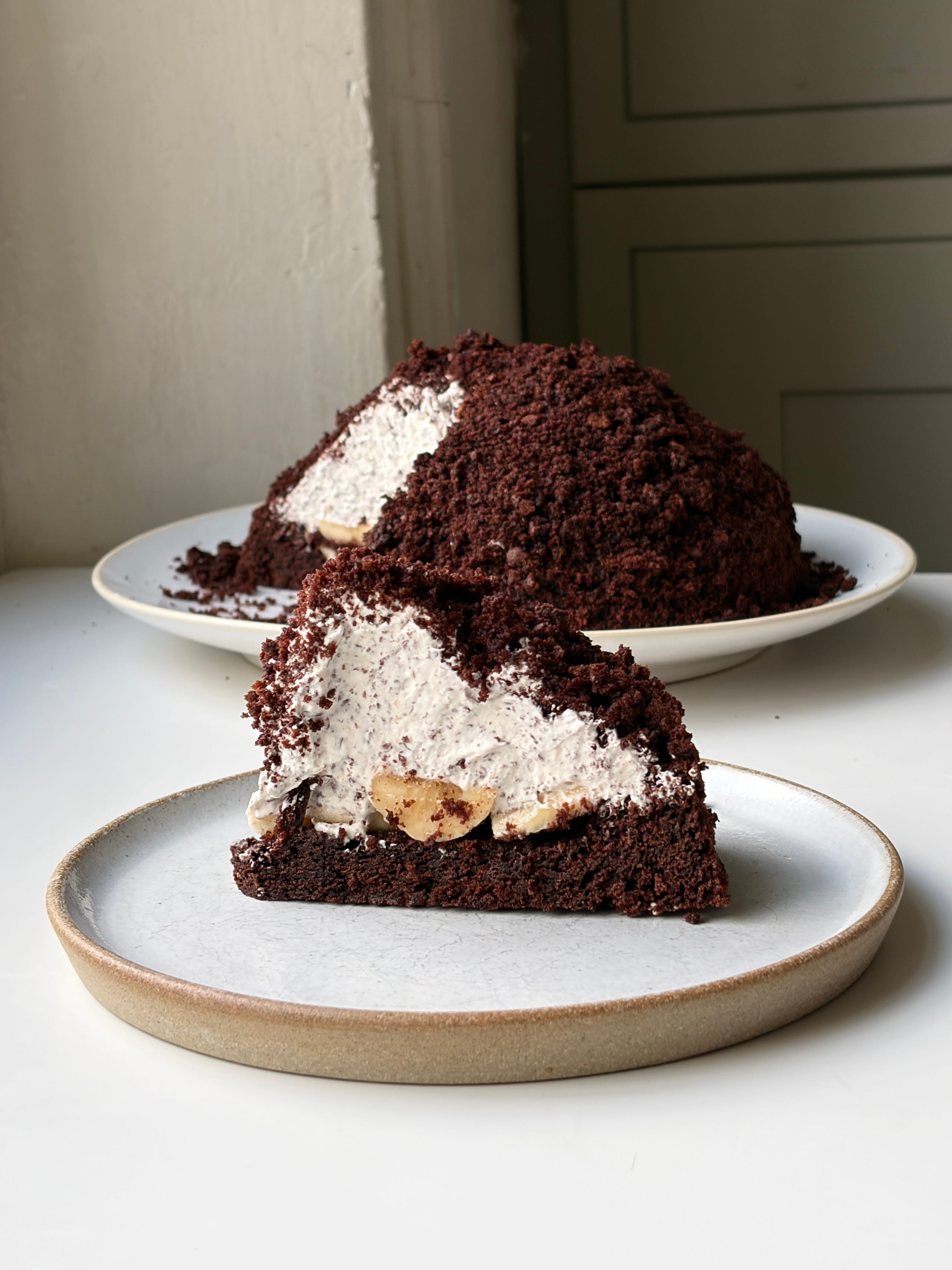 Later, I assembled a molehill cake with a banana-caramel filling and fresh bananas for added texture. Trying the new creation as a whole was a little bit disappointing. Punchy caramel flavours threw this cake off balance, stealing attention from the other components. The new addition also seemed at odds with this cake’s core premise - uncomplicated, comforting, easy to make. I whipped up another cake with sliced bananas and instantly realised that sometimes the simplest answer is the right one.