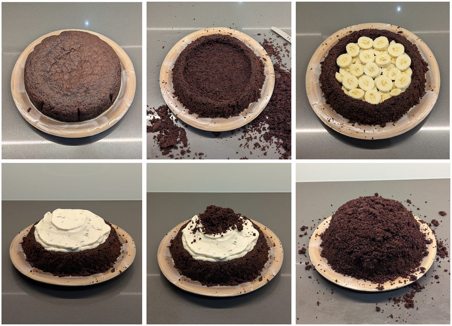 A key component in the Molehill cake is sliced bananas. This sounded very unimaginative, so I set myself the challenge of elevating it. The cake’s flavour profile- chocolate, cream and bananas-is similar to Banoffee pie, created in the 70s by Ian Dowding at the Hungry Monk restaurant in Sussex. This iconic creation consists of a pastry shell filled with condensed milk caramel (dulce de leche) and bananas, topped with whipped cream and chocolate shavings. This gave me a clear vision- caramel was the way to go- so I set out to test ways of incorporating it into the recipe. Trials included: