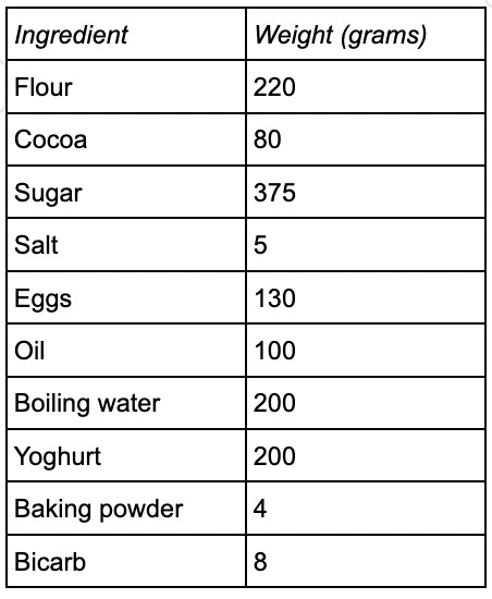 Control sample: made using my staple recipe- full of cocoa, sugar and lots of yoghurt and boiling water to keep it nicely moist. It has a very open, springy crumb and a definite/pronounced cocoa flavour.