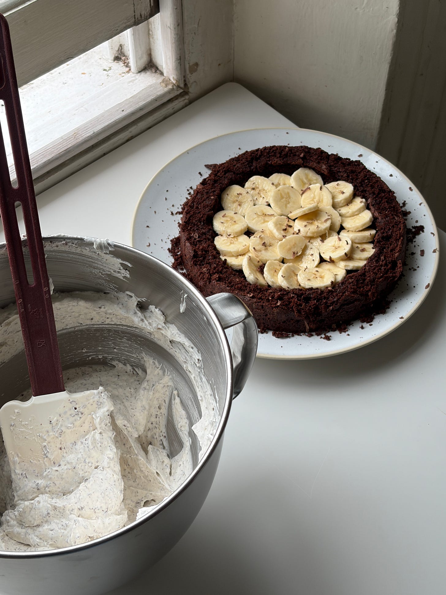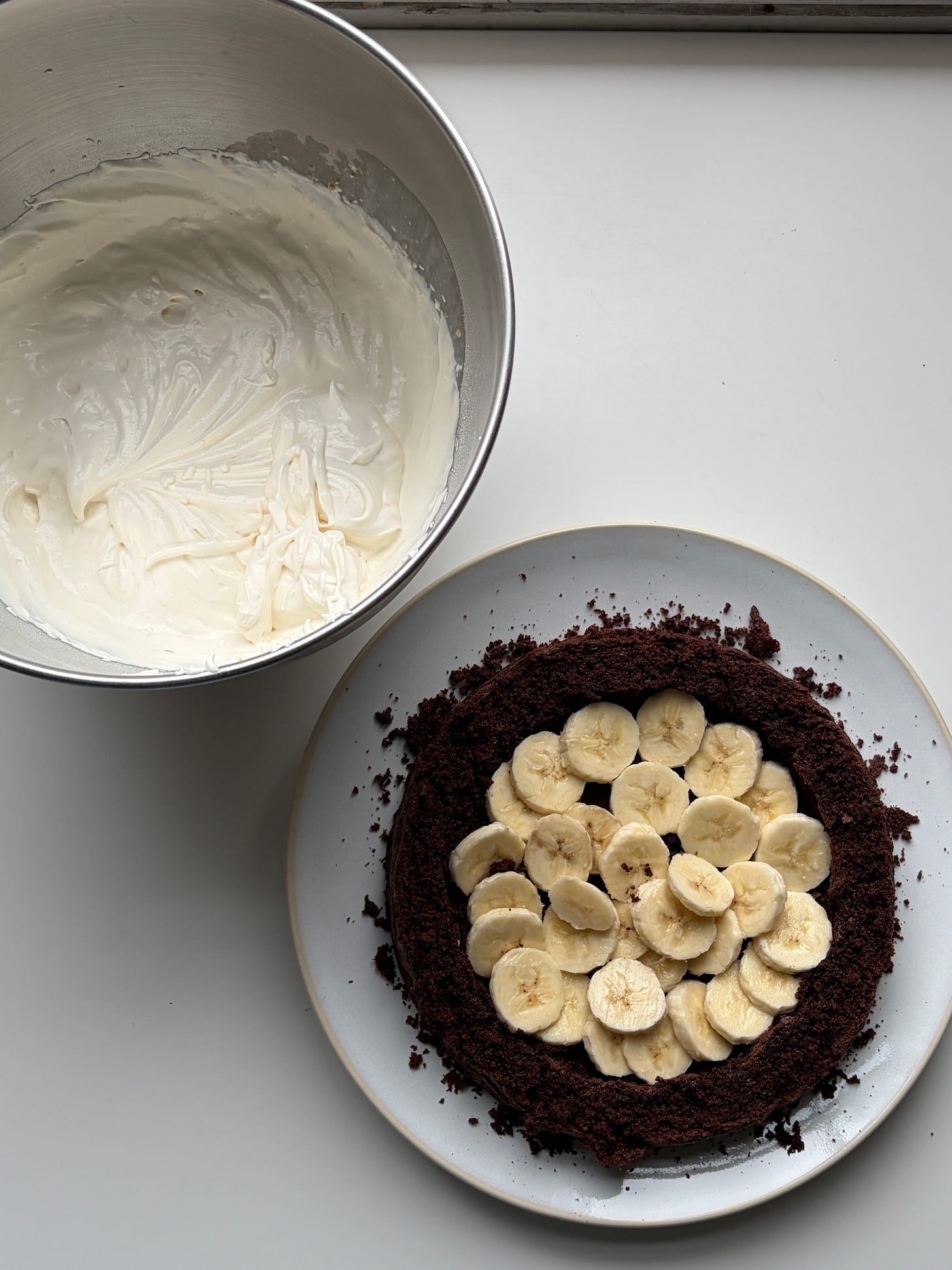 Arrange the sliced bananas over the base of the well, then layer the cream on top. Smooth it out with a palette knife (or a butter knife) to form a dome.