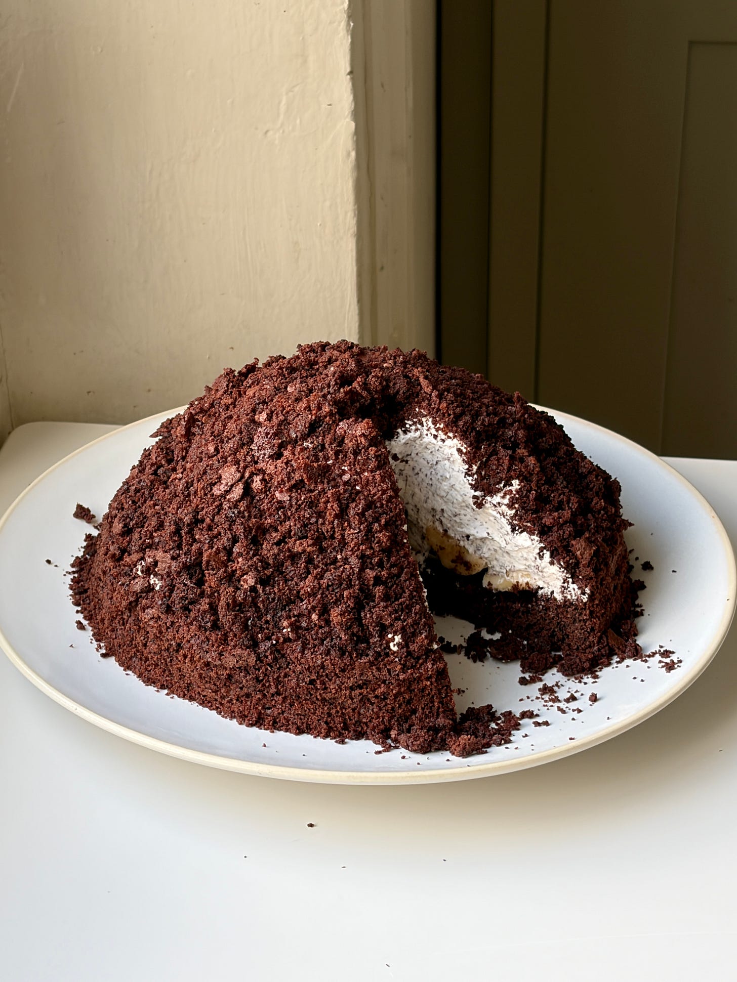 The base of the Molehill cake is a chocolate sponge made employing the ‘muffin’ method. Unlike the creaming method, which aerates the fat and sugar before adding the dry and liquid ingredients, the muffin method combines the dry and wet ingredients in separate bowls, then mixes them swiftly to avoid gluten development. The result is a tender, ultra-moist, fluffy sponge. The best-known chocolate sponges made with this method are Devil’s Food cake and Guinness cake.